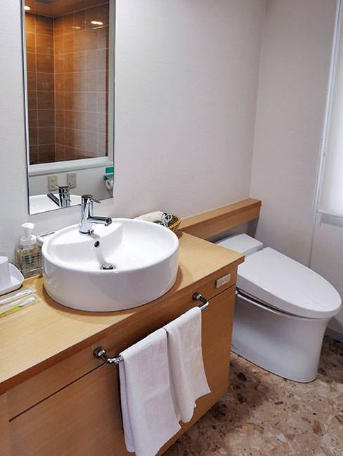 そして洗面台と御不浄周り。持参のクスリ入れやグルーミングキットを置くのに充分なスペースがあります。
