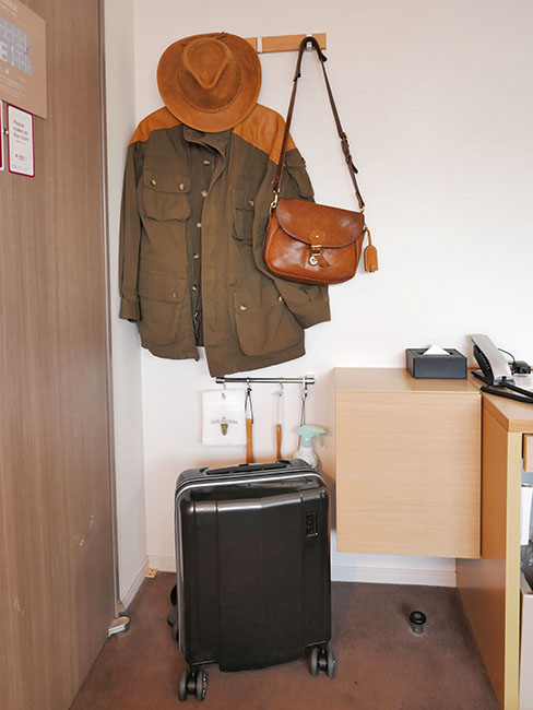 安価なビジネスホテルですから、クロゼットなんてありません。こうやってジャケットや帽子をひっかけます。
