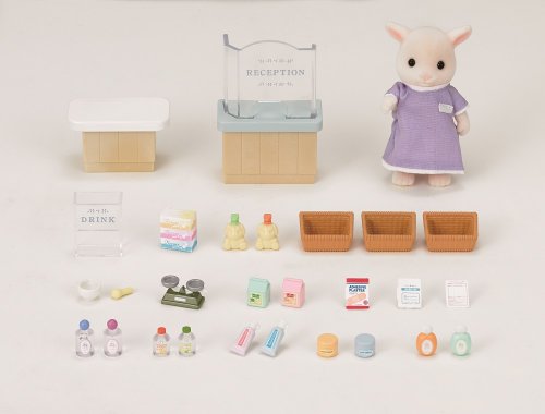 ●セット内容/ヤギの薬剤師さん、カウンターテーブル、サイドテーブル、バスケット×3、ドリンク棚、乳鉢、乳棒、天秤、ボディソープ×2、化粧水×2、乳液×2、ドリンクパック×2、ドリンクボトル×2、はみがきこ×2、ハンドクリーム×2、ティッシュボックス、ばんそうこう袋、くすり袋、処方箋
