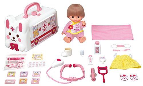 [セット内容]ショートヘアメルちゃん本体 (パンツ付) 、パジャマ、ワンピース、スリッパ、松葉杖、救急車本体、聴診器、おふとん、まくら、しんだんカード、注射器、体温計、包帯、ばんそうこう、ギブス、おくすり袋、くすりびん、ぬりぐすり、おくすりシール、おくすり手帳、診察券、くし、ミニブック