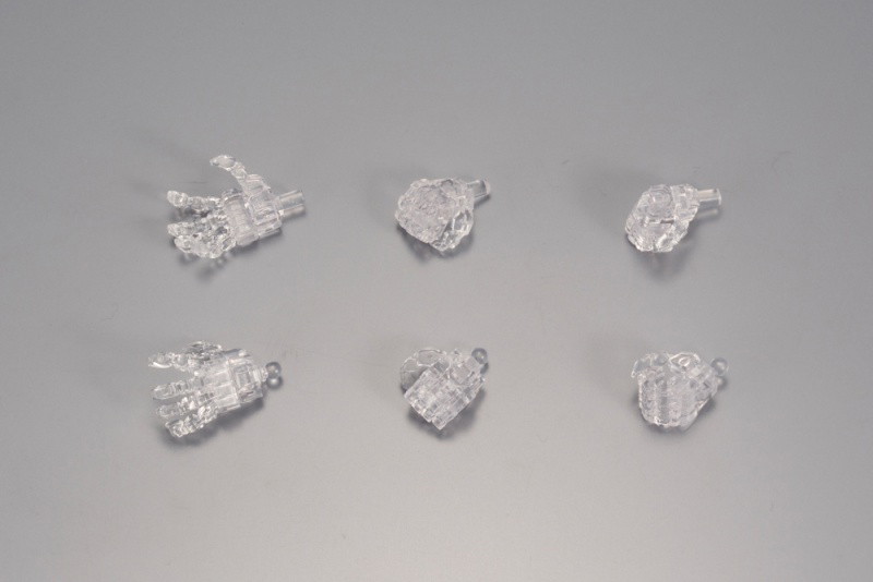 荒々しく力強いデザインで人気のハンドユニット。無色クリアー成形となることで更なる汎用性を獲得しました。塗装表現で赤熱や発光などの多様な遊び方が可能です。