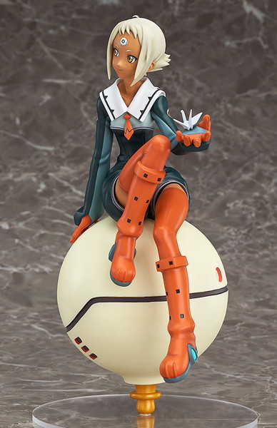 ガイナックス20周年記念作品、SFアニメ『トップをねらえ2!』より、主人公のひとり「ラルク・メルク・マール」が制服姿で登場。劇中で印象的な「球体イス」に腰掛けた姿を立体化いたしました。近未来的な制服や小物をはじめ、スラリと伸びた脚、クールななかにも「ノノ」を想う優しげな表情など、随所にこだわった造形は必見です。オデコのピースシールは取り外しが可能です。