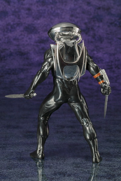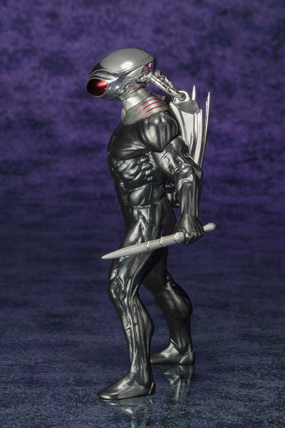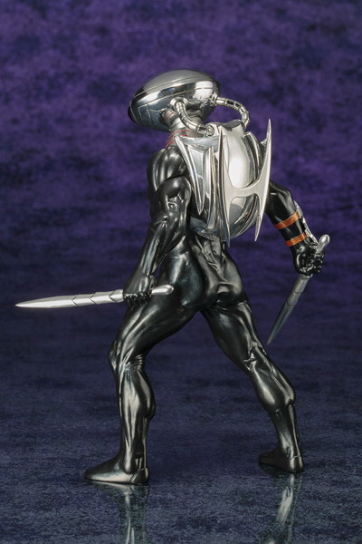 ブラックマンタを唯一無二の存在としているその特徴的な耐圧ヘルメットは、銀色のメッキ加工に仕上げ、背負ったバックパックと白兵戦用のブレードも同じくメッキ加工にいたしました。全身を包む黒いボディスーツは単色ではなく、一層色を追加したことで、独特のツヤを持ち、怪しげな光を放ちます。