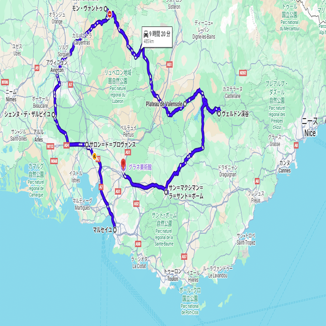 マルセイユ→サロン→アルピーユ山脈→モン・ヴァントゥ→ヴァレンソール高原→ヴェルドン渓谷→サン=マクシマン=ラ=サント=ボーム→エクス=アン=プロヴァンス