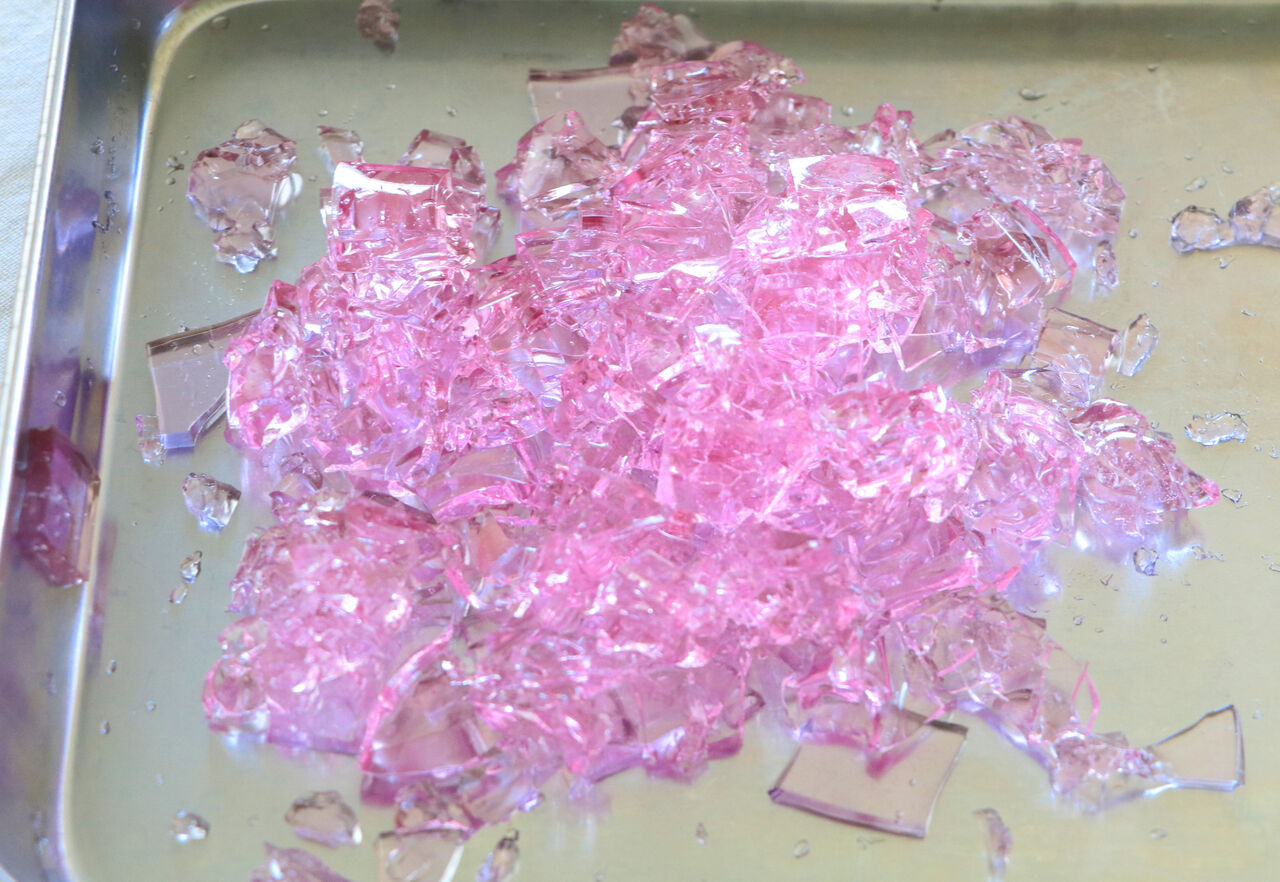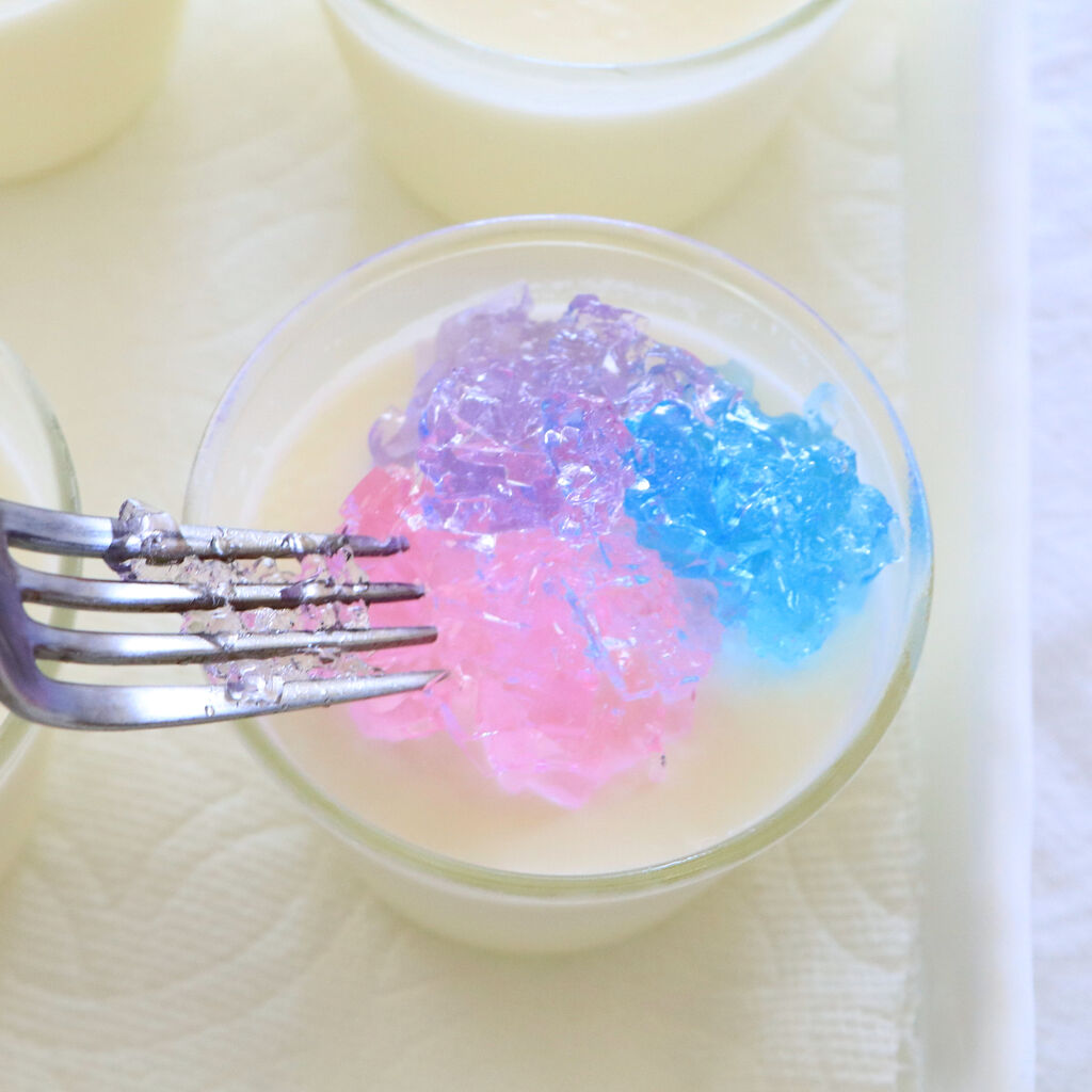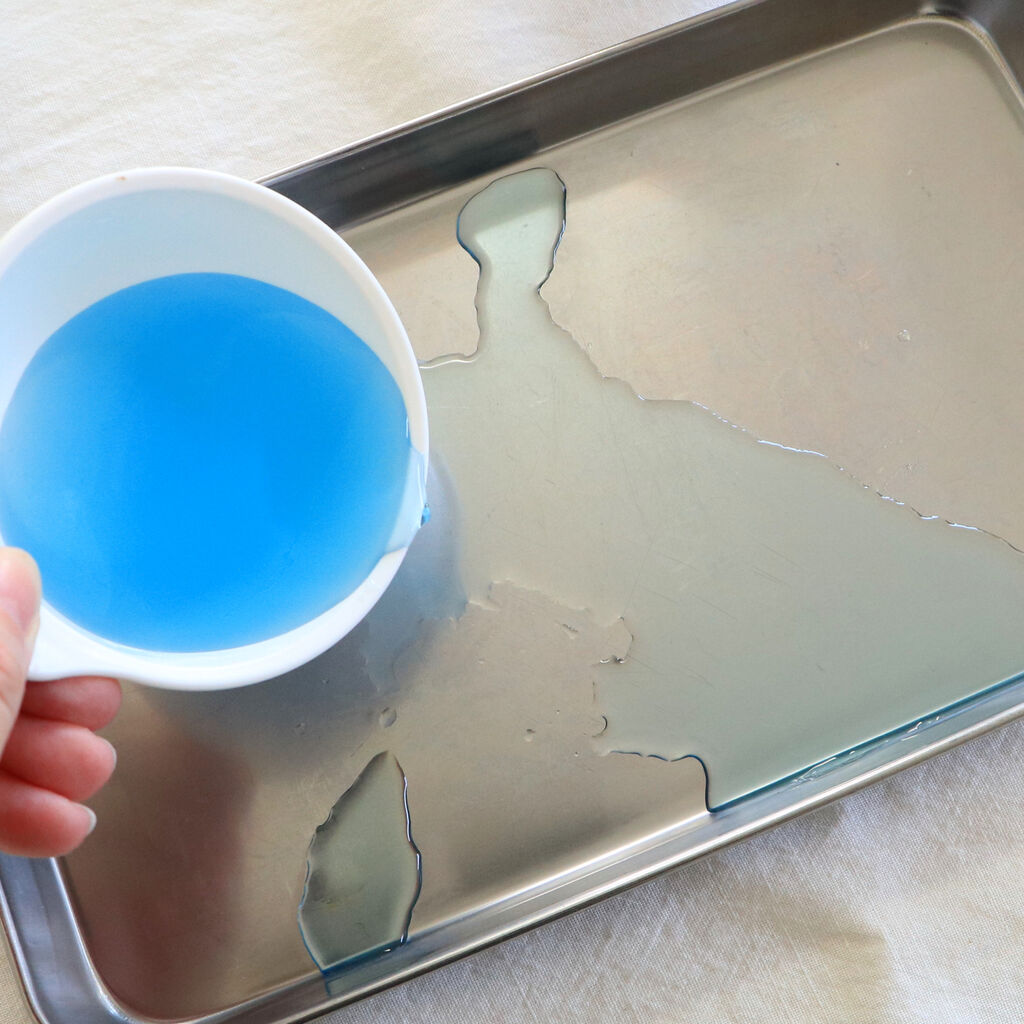 ゼリーが固まったら、ナイフでサイコロ状にカットする。