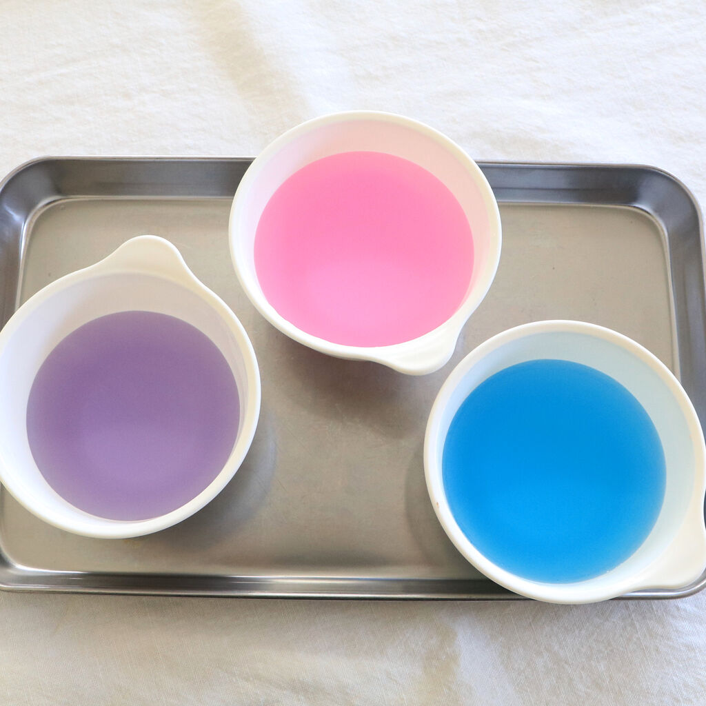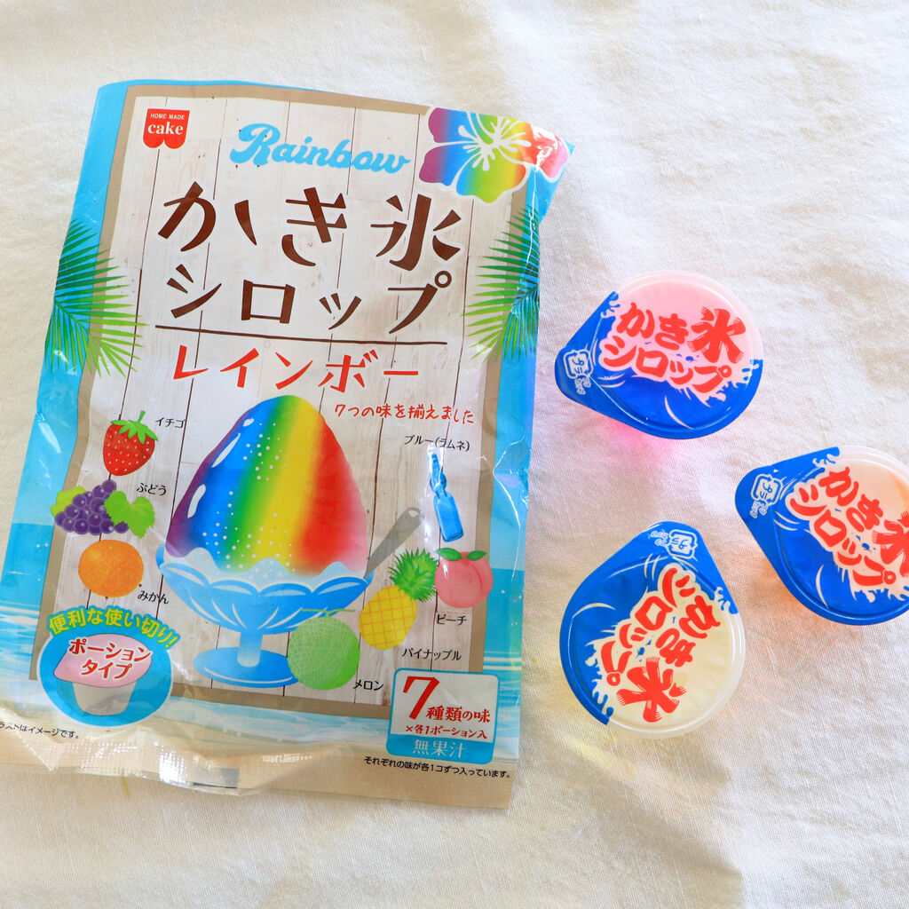 ③②をカップに分け入れて、それぞれにかき氷シロップを入れて