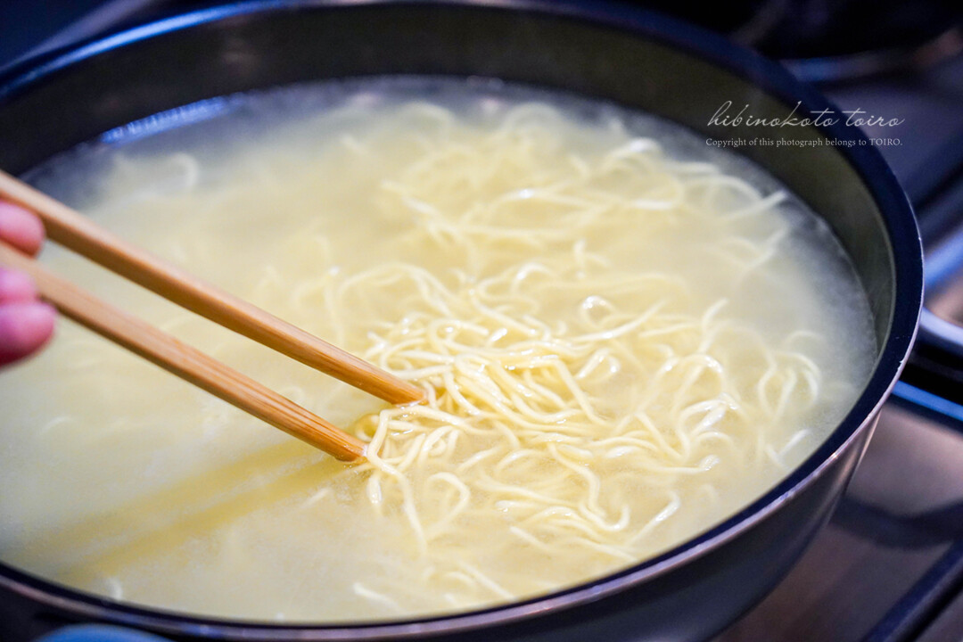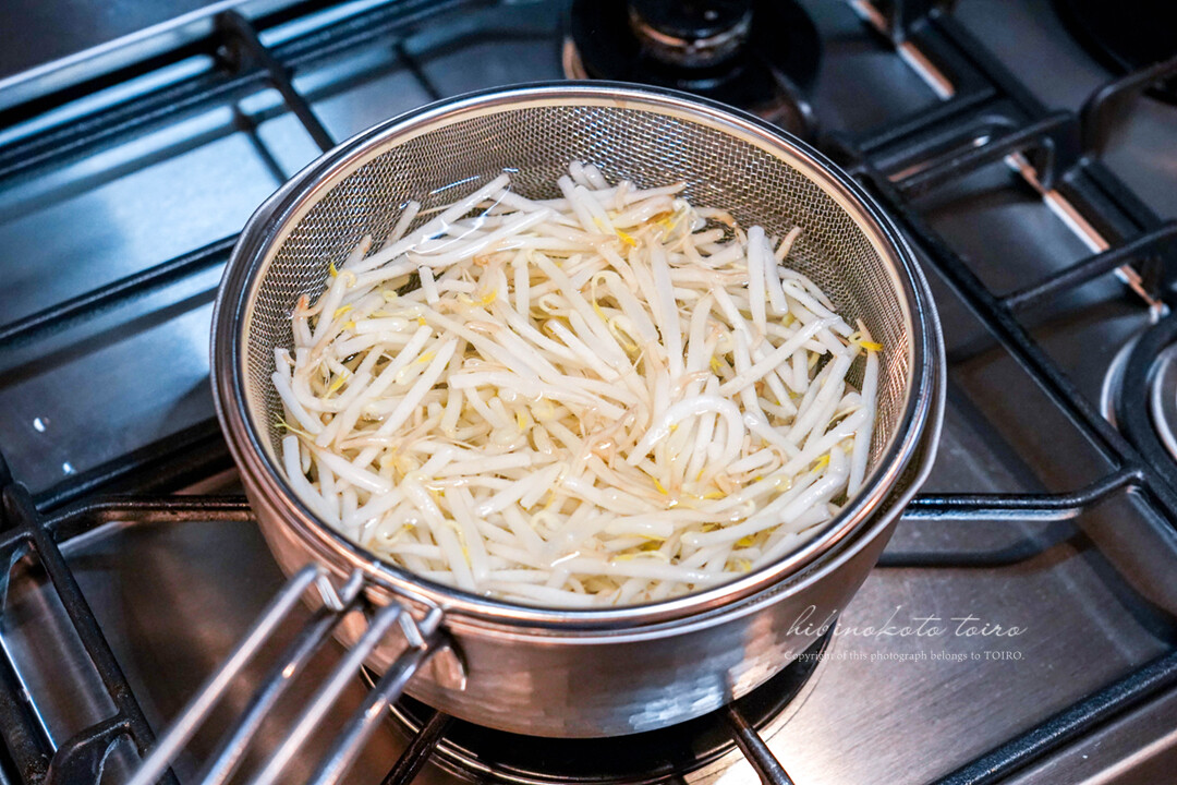 この状態でもやしを入れて1分半〜2分ほど茹でたら