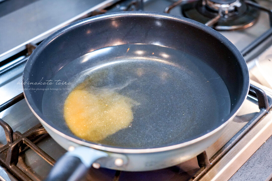 深鍋(フライパン)に1Lの水を入れて、きび砂糖と酒をそれぞれ大さじ1入れて中火にかけます。