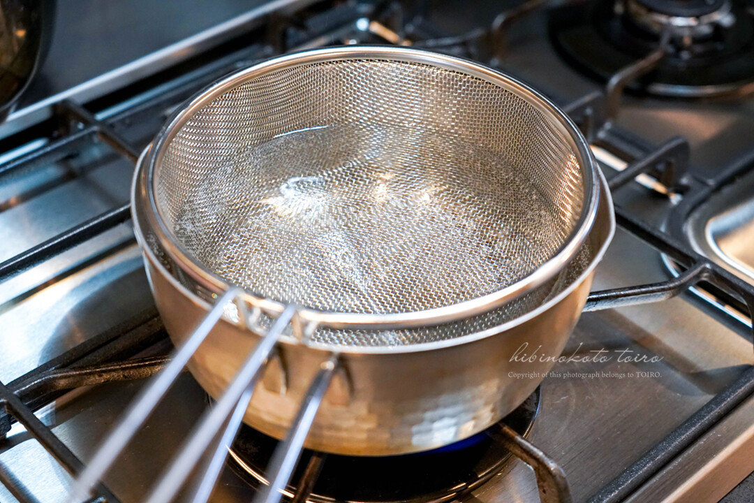 この前買ったこのざるがね、鍋にちょうどいいサイズで。