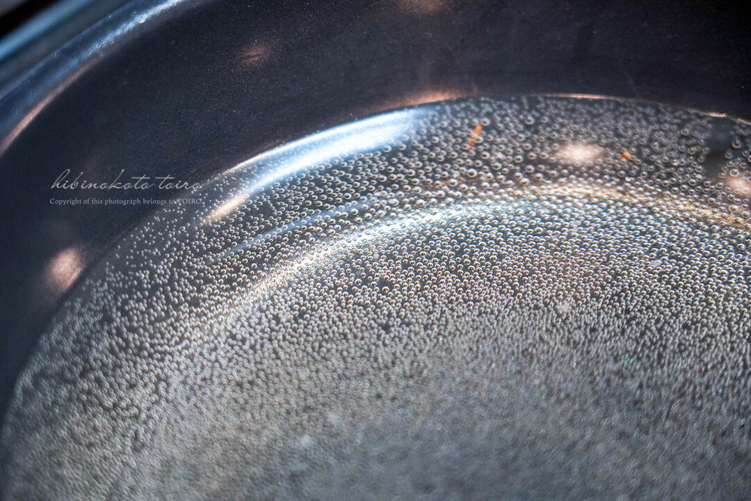 ボコボコと沸騰する前、鍋の中がこんな状態になったら火を弱めます。