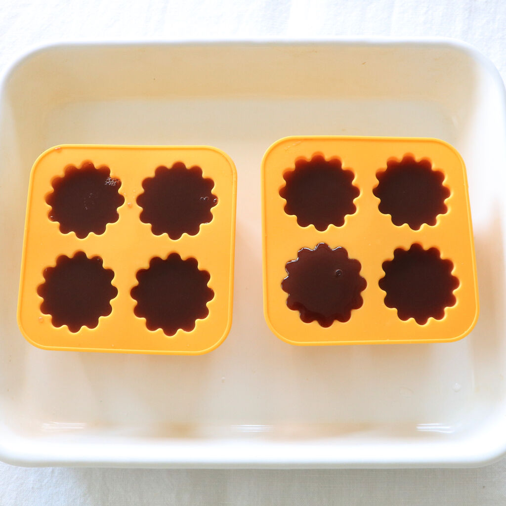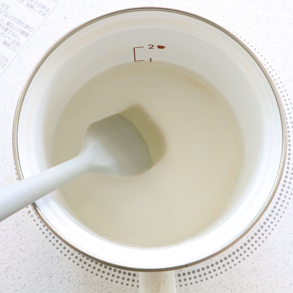 お鍋に水と粉寒天を入れて弱火にかけ溶かしていく。