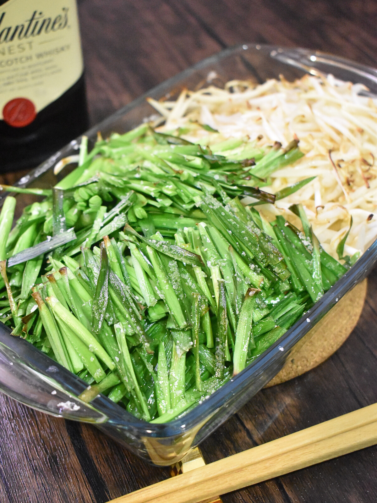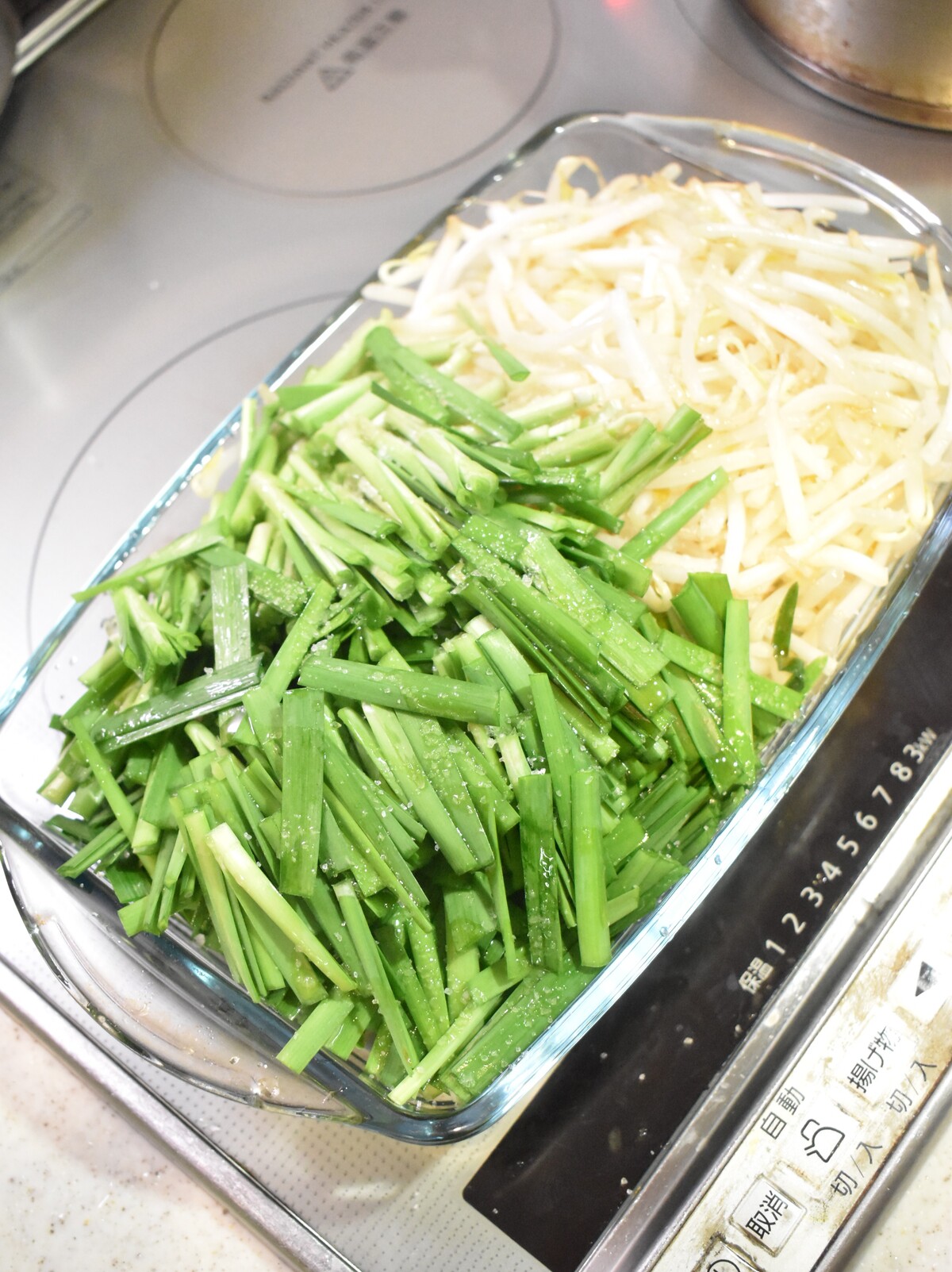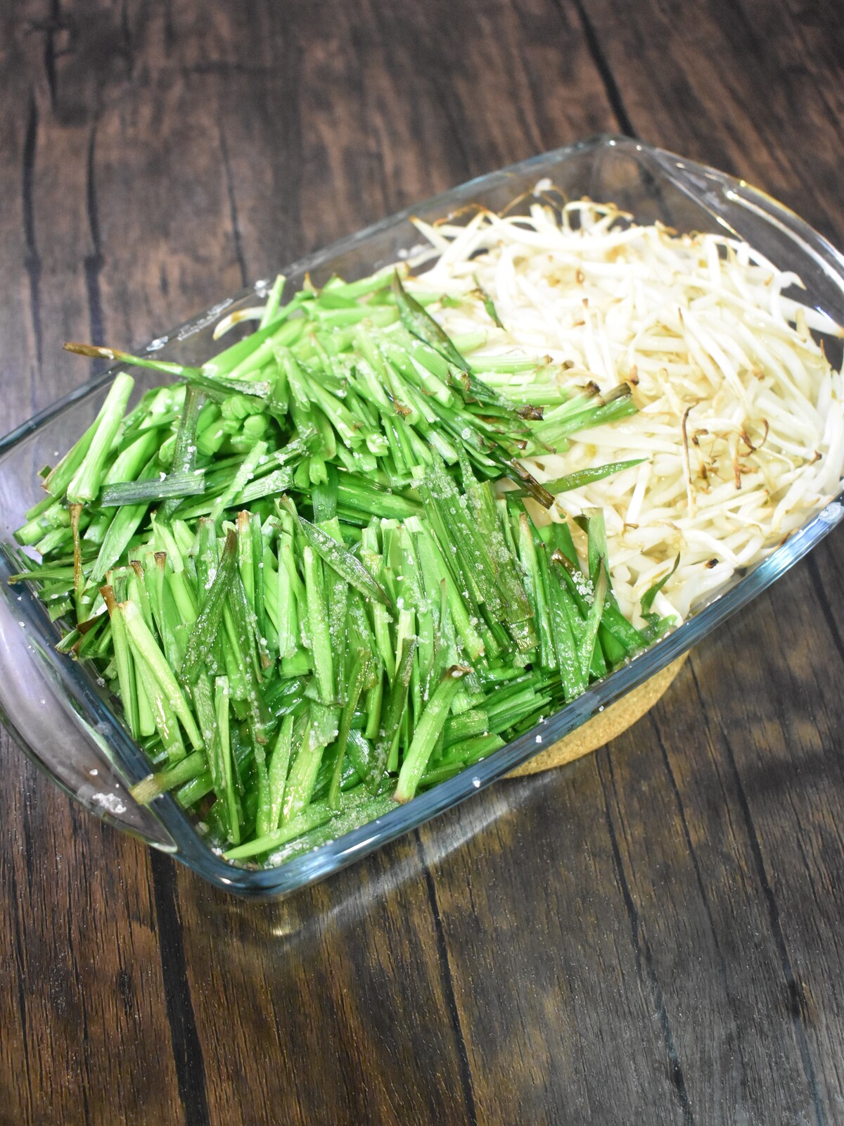 1.耐熱皿に4㎝幅に切ったニラ、もやし、上から【A】をかけます
