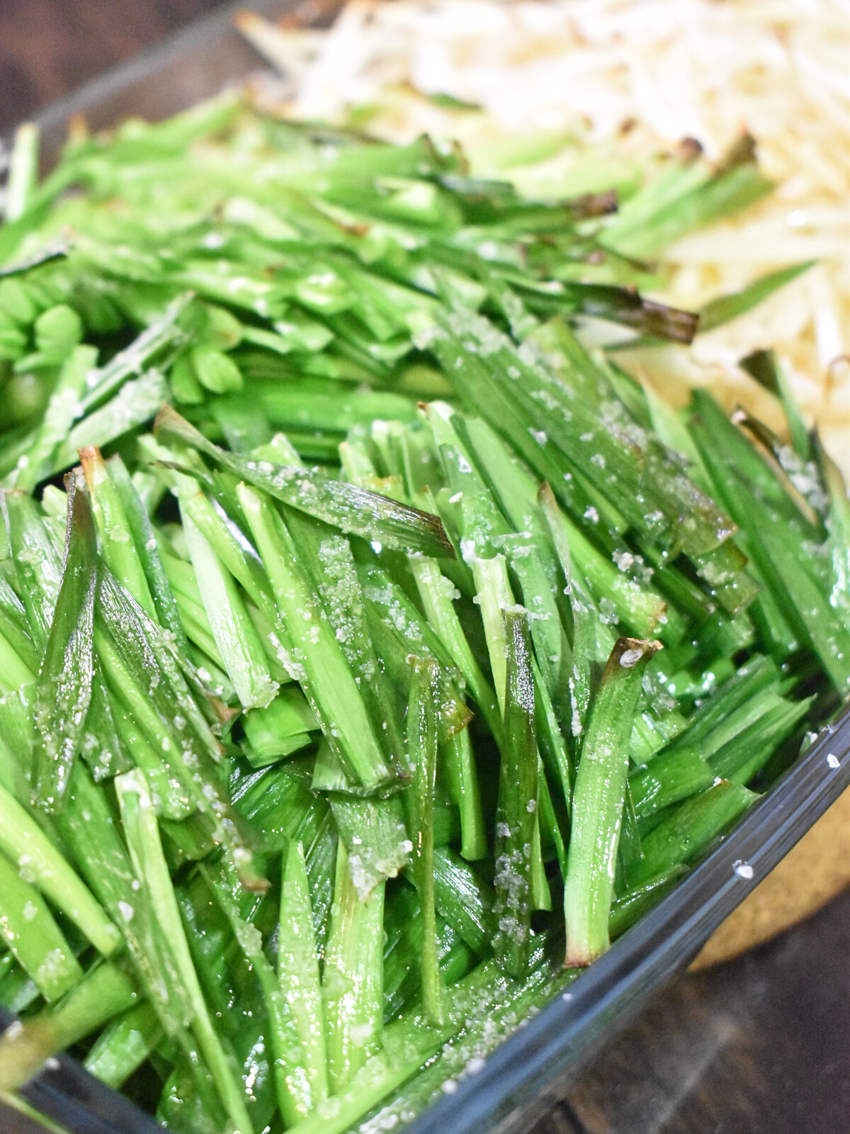 なので耐熱容器にニラともやしをギュウギュウに詰め込んでオーブンで焼きました。