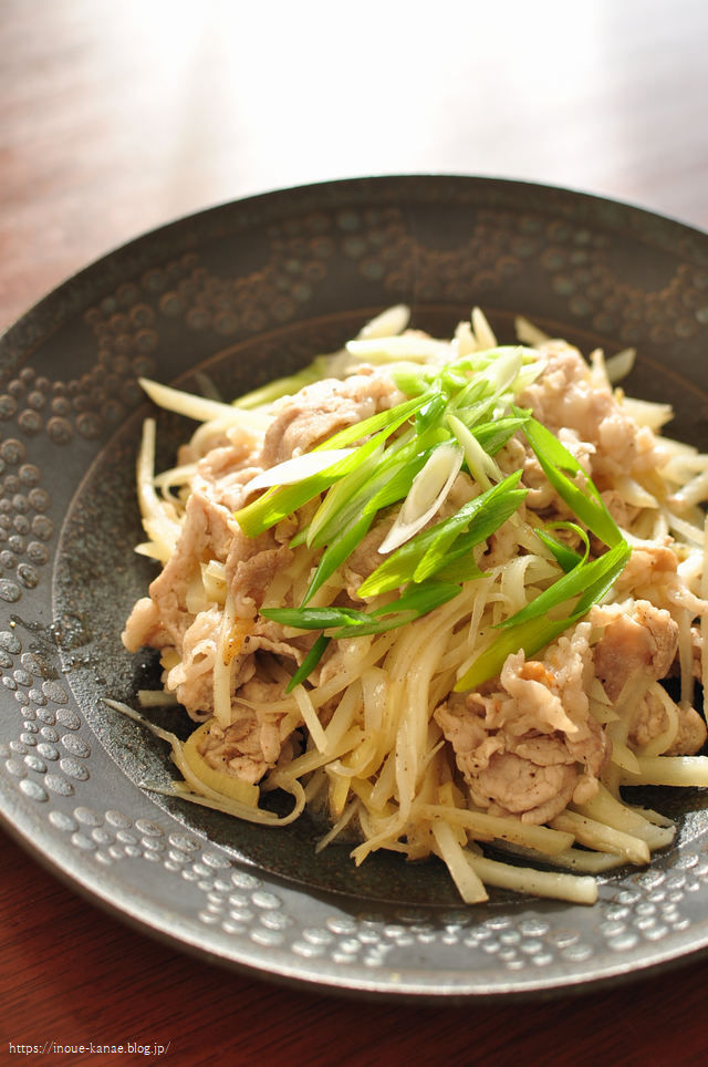 1)ジャガイモは千切りにして水に1分ほどさらす。生姜はせん切りにする。豚肉は大きければ食べやすい大きさに切る。