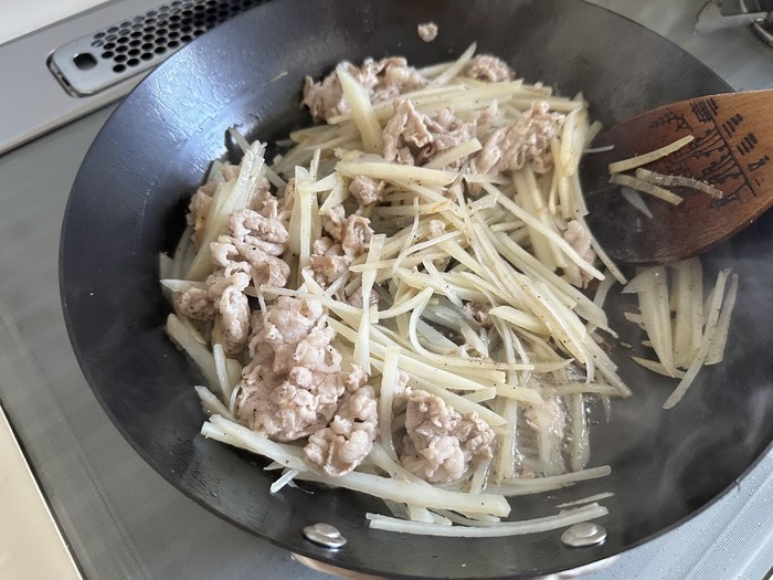 ※ジャガイモは割と細かい千切りにしたのでさっと炒めで火が通りました。ふと切りになってしまったら、蓋をして蒸し焼きにしたりして、火を通してください。