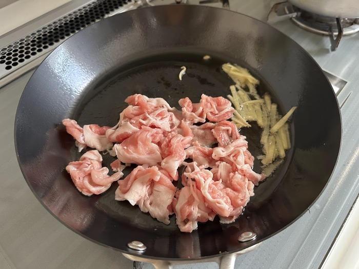 2)フライパンにごま油を入れて中火にかける。生姜を入れて香りがたってきたら豚肉を入れて八割くらい色が変わるまで炒める。