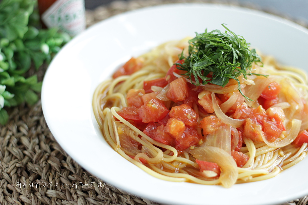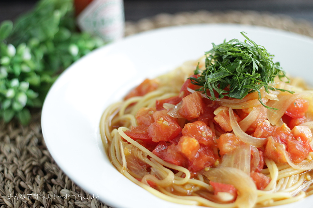 さっぱりさわやかなトマトと青じそのパスタのレシピですよ~!
