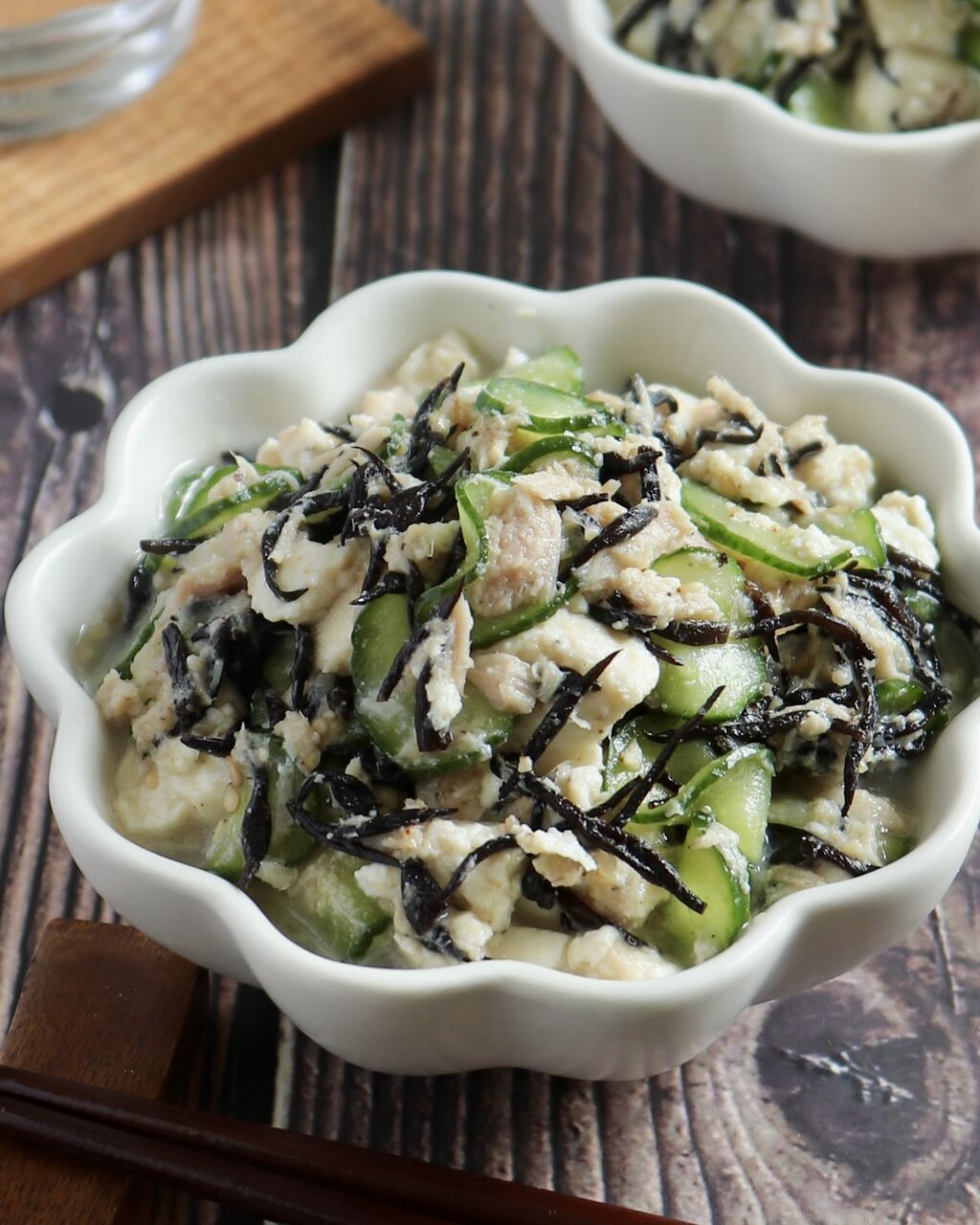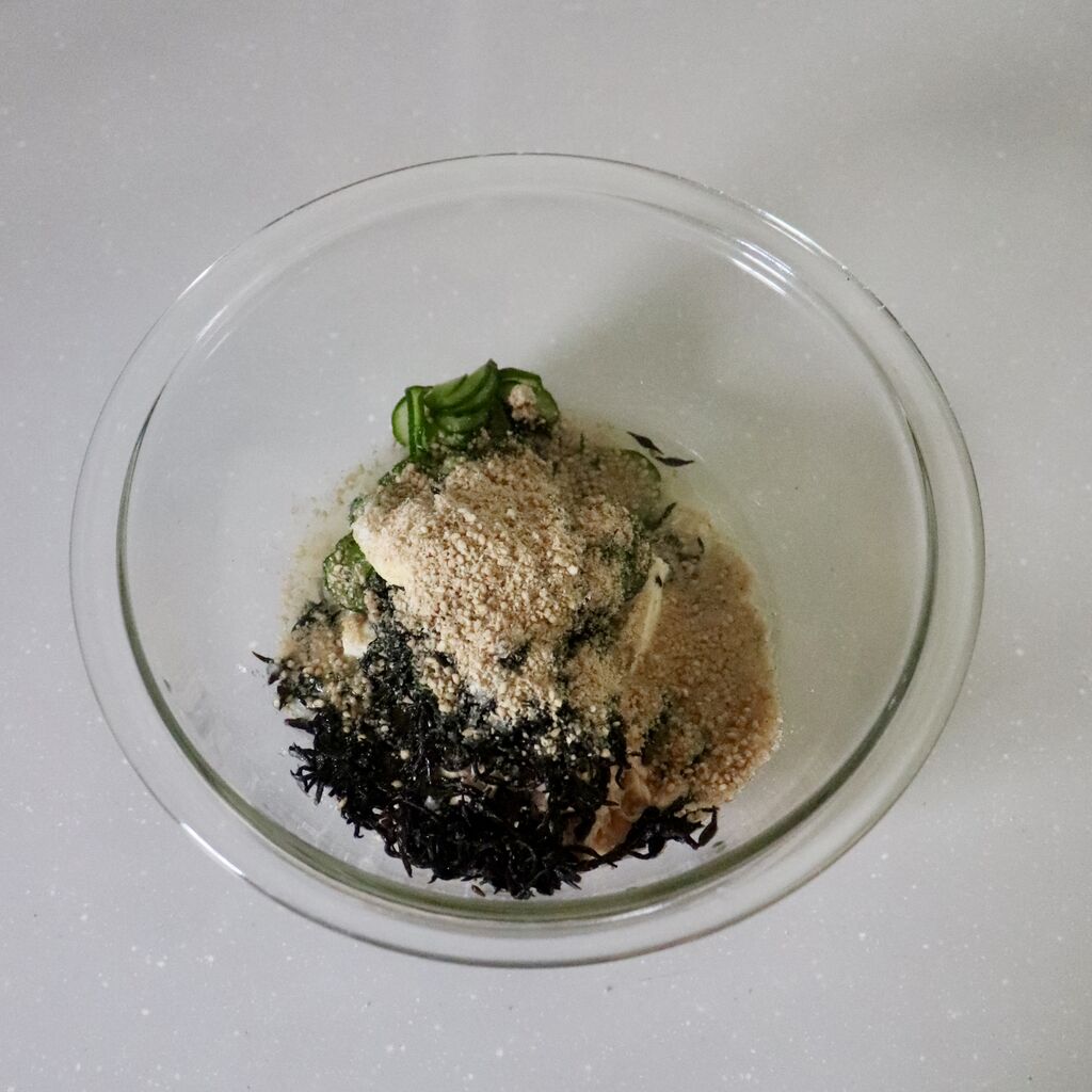 ② ボウルにしっかり水気を絞ったきゅうり、しっかり水気を切ったひじき、軽く油を切ったツナ缶、木綿豆腐、Aを入れてしっかりと和える。