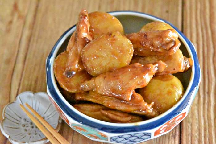 【手羽中と新じゃがの照り煮】 <材料・2人分> ・手羽中 10本(約250g) ・新じゃが 9個(約270g) ・サラダ油 大さじ1 ●水 200cc ●酒・みりん 各大さじ1 ●醤油 大さじ2 ●砂糖・顆粒だしの素 各小さじ1 <作り方・調理時間25分> ①手羽中はペーパーで水気を拭き取る。 容器に●を混ぜ合わせる。 新じゃがは皮ごとキレイに洗う。 ②フライパンにサラダ油をひき中火で温め、 手羽中の皮目を下にして並べ新じゃがもも入れ焼き色がつくまで焼く。 ③手羽中は焼き色がついたら裏返し、 ●を加え沸騰したら落とし蓋と蓋をして中火で10分煮る。 ④10分煮たら蓋と落とし蓋を取り、 強火にしてフライパンをゆすりながら煮汁がなくなるまで煮詰める。 <コツ・ポイント> ・手羽中と新じゃがはしっかりと焼き色をつけて下さいね。 ・新じゃがはひとくちサイズに切って下さいね。 ・普通のじゃがいもを使う場合は、皮をむいてお水に浸してアクを抜いてから調理して下さいね。