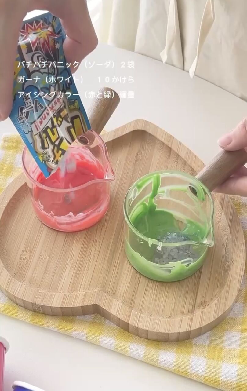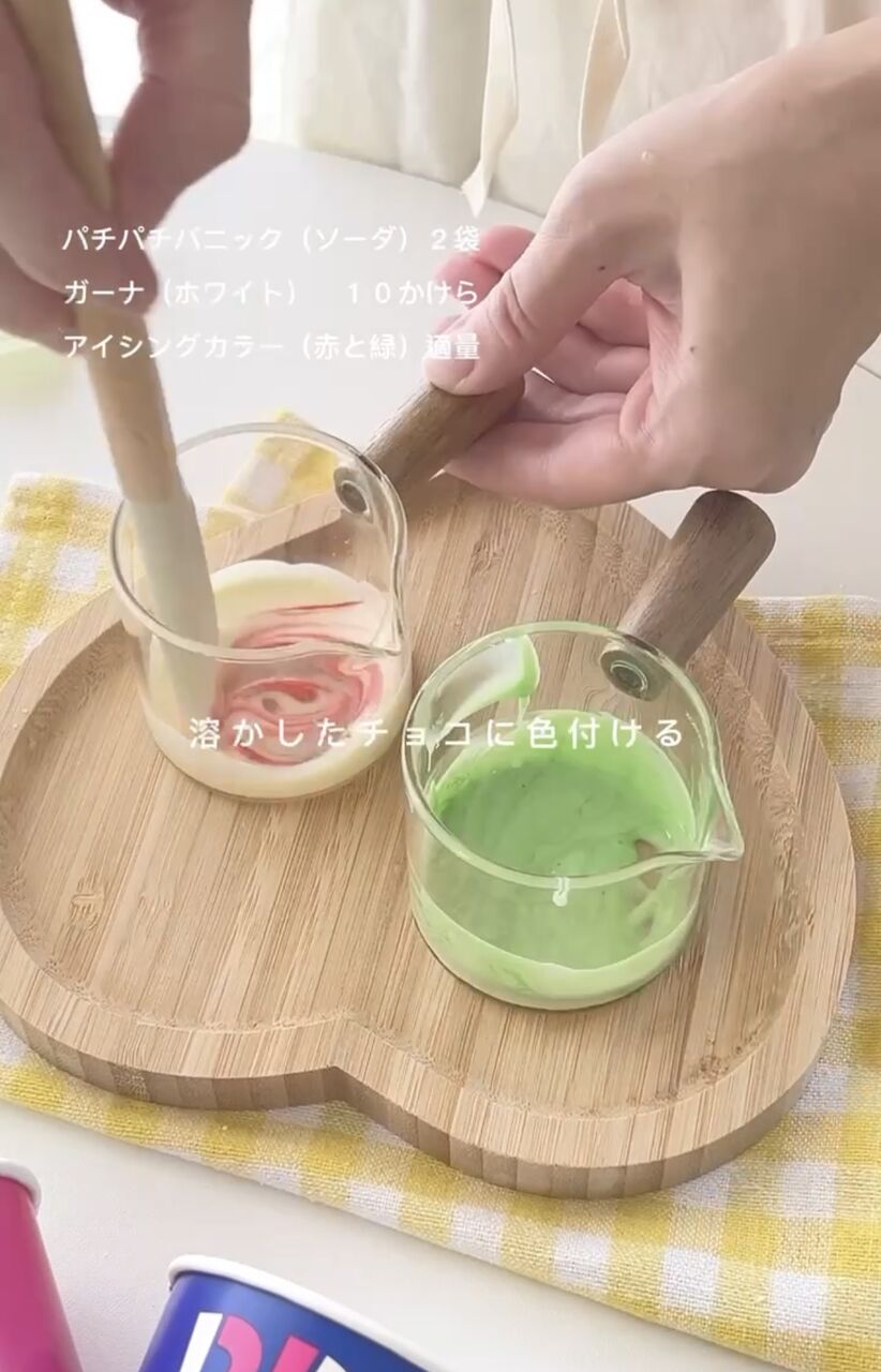 ①板チョコを5かけらずつ小さな容器に入れて湯煎して溶かす。