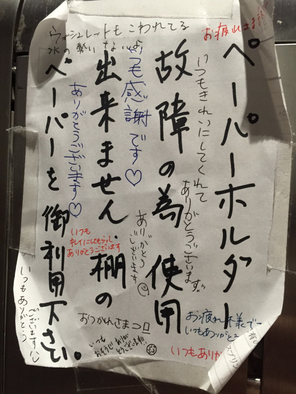 私が、ほぼ毎朝通っている某トイレなのですが、ホルダー壊れの貼り紙に、利用者から(ウォシュレットの指摘は省いて)ありがとうとかお疲れさまなどの労いの言葉が書かれているのです。