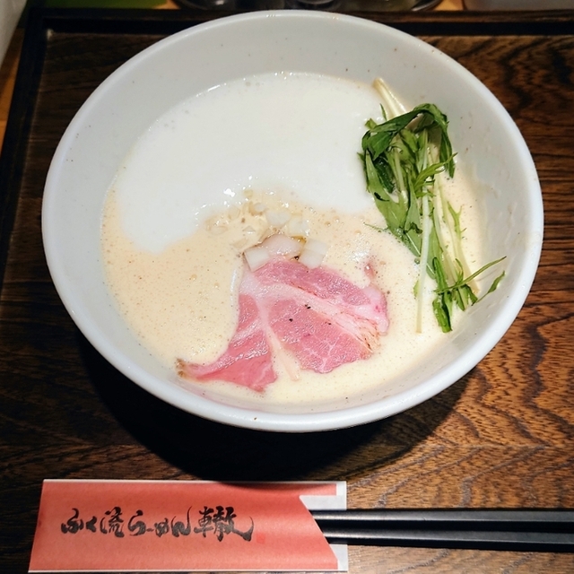 チャーシューは豚肩ロースがメインで、らーめんによっては鶏ムネチャーシューもあり組み合わせを楽しめます。写真は私がいつも注文する「味玉ふく流らーめん+豚肩ローストッピング」です。白湯スープと柚子のエスプーマが合わさってとてもクリーミーなスープに仕上がっています。チャーシューはとろけるタイプではなく、どちらかというとしっかり目で、お肉と油の甘味がなんともいえず私は大好きです☆