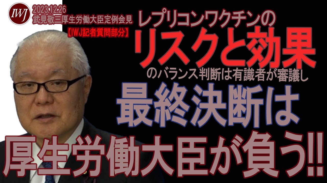 昨年の12月8日の定例会見: 武見敬三厚労大臣に対し「11月28日に国内承認されたレプリコンワクチンについての懸念として)「ワクチン接種後、分解されずに血清中に残存するスパイクタンパクが心筋炎などの有害事象を引き起こしているとする指摘もあり武見大臣のレプリコンワクチンに関する安全性の説明はこうした指摘と矛盾しています。やはり有害事象が起こる危険性・リスクがあるのではないでしょうか?」「同様のリスクを負っていないと責任をもって断言できるのでしょうか?」という質問をなさり武見敬三厚労大臣は以下のようなご発言なさっておられます。
