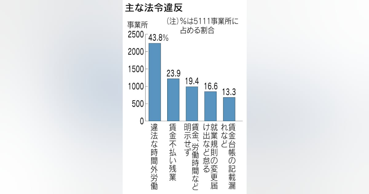 過酷な労働を強いる「ブラック企業」の疑いがある企業への厚生労働省の立ち入り調査で、全体の82%に当たる4189の企業・事業所で違法な時間外労働など労働基準関係法令の違反があったことが17日、分かった。残業や休日出勤の時間が過労死の認定基準の一つである月100時間を超えたのも730事業所に上る。違法な過重労働の事業所がまん延する実態が裏付けられた形だ。厚労省は違反があった企業に是正勧告をしており、改善が見られない場合は所管の労働基準監督署が労働基準法違反容疑などで送検、社名を公表する方針。