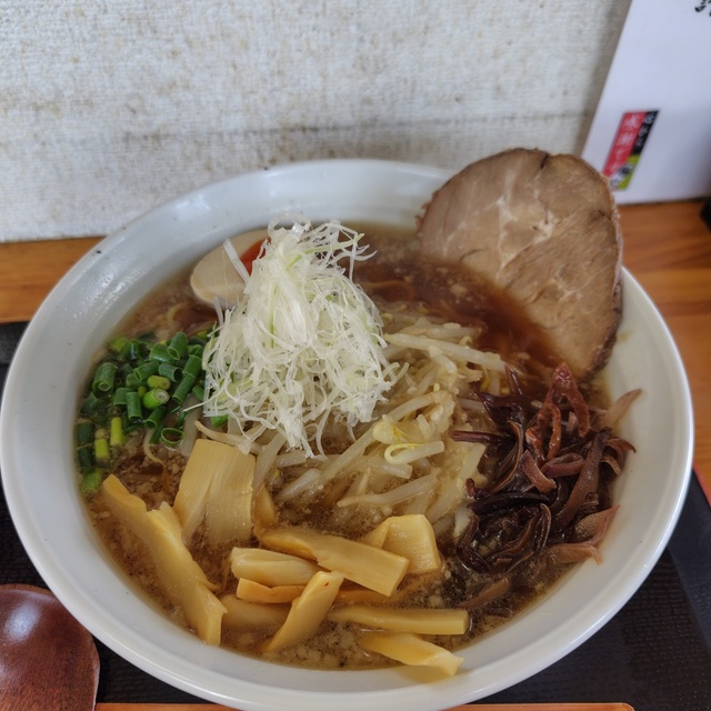 具材は、チャーシュー・メンマ・味玉ハーフ・もやし・刻みキクラゲ・スリムねぎ・ねぎ、です。