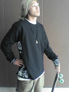 エバーラスティングライドエバラスのリバーシブルロンTです。これで¥8800とリバーシブルにしてはプライスもかなりアツイです!写真で分かるようにサイドとそでににペイズリーがあしらわれててかなりカッコいいです!そりゃこんなカッコいいやつ着たら顔もこんなんなっちゃいますね(笑)ちなみに今回のイケメンはMr絵書キングことミッキです。知ってる人も多いのでは?ちなみにスケート時の彼をしてみました。分かる人には分かると思いますが、なかなかの仕上がりでしょ?