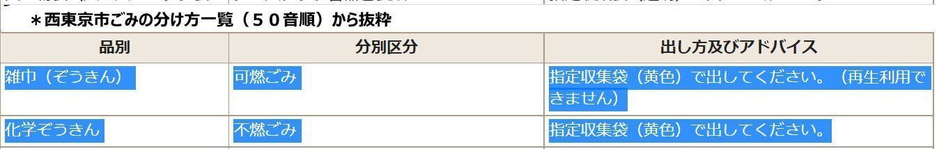皆さん、雑巾は可燃ごみとして処分して下さい。宜しくお願い致します。