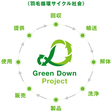 一企業の技術だけでは、「羽毛循環サイクル社会」は実現できません。羽毛に関わる企業をはじめ、地域社会、そして生活者一人ひとりの理解と協力により羽毛循環システムがつくられます。それを推進していくのが、Green Down Project(グリーンダウンプロジェクト)です。