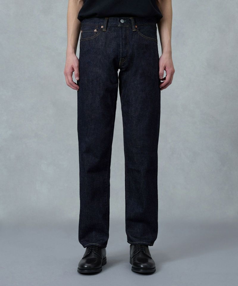 ロープ染色を繰り返し特濃インディゴブルーに染めたジンバブエコットン/6番手糸を旧式力織機でゆっくりと織り上げた15.7オンスデニム生地は、力強さのある表情を持ち、濃淡のコントラストのある経年変化と自然なタテ落ちを楽しめます。