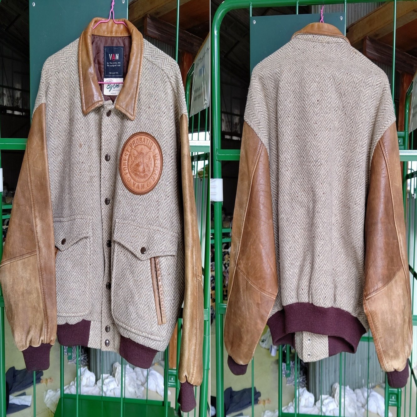 今回レスキューしたのは、VAN JACKET / バンの袖革スタジアムジャンパー。身頃がヘリンボーンのツイード生地で襟も革だ。
