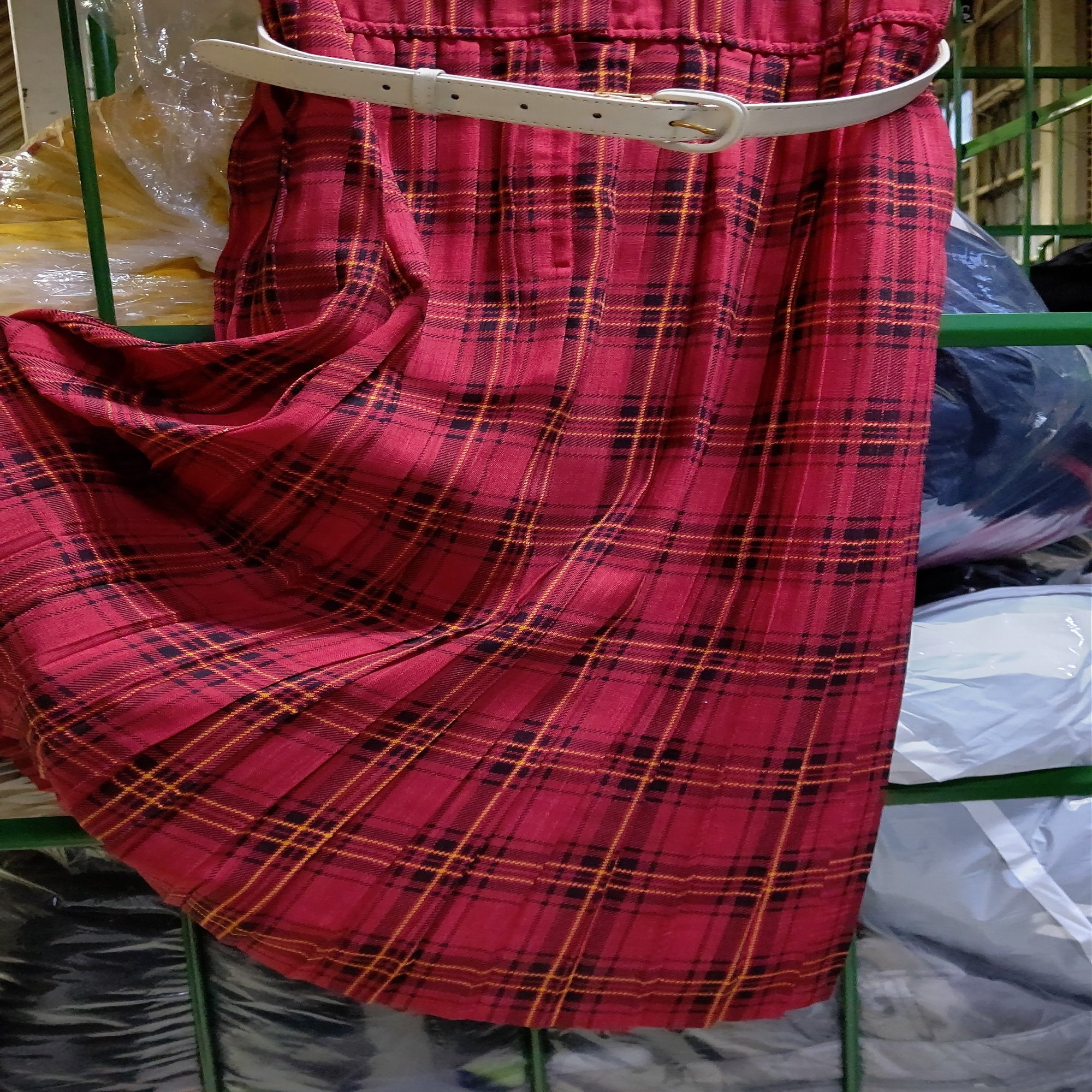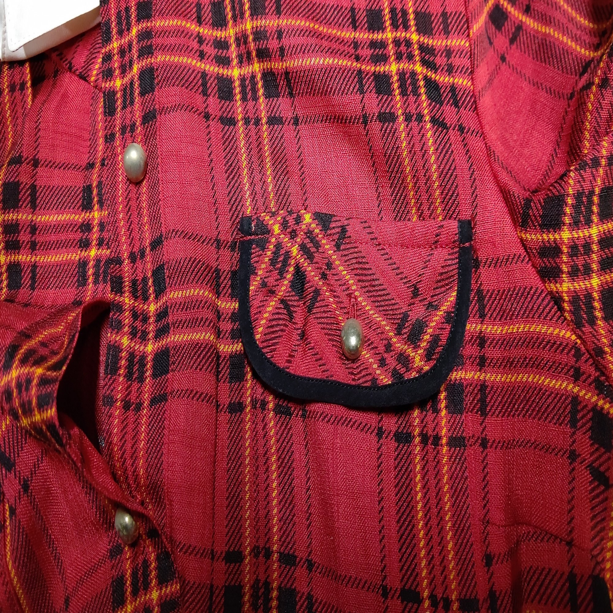 赤いタータンチェックの生地に金色のメタルボタン、襟と袖口に白い切り返し、ウエストにも白いベルト、胸のフラップには黒のパイピング、スカートには細かいプリーツが入っていて、細部までこだわったお洒落な一着です。