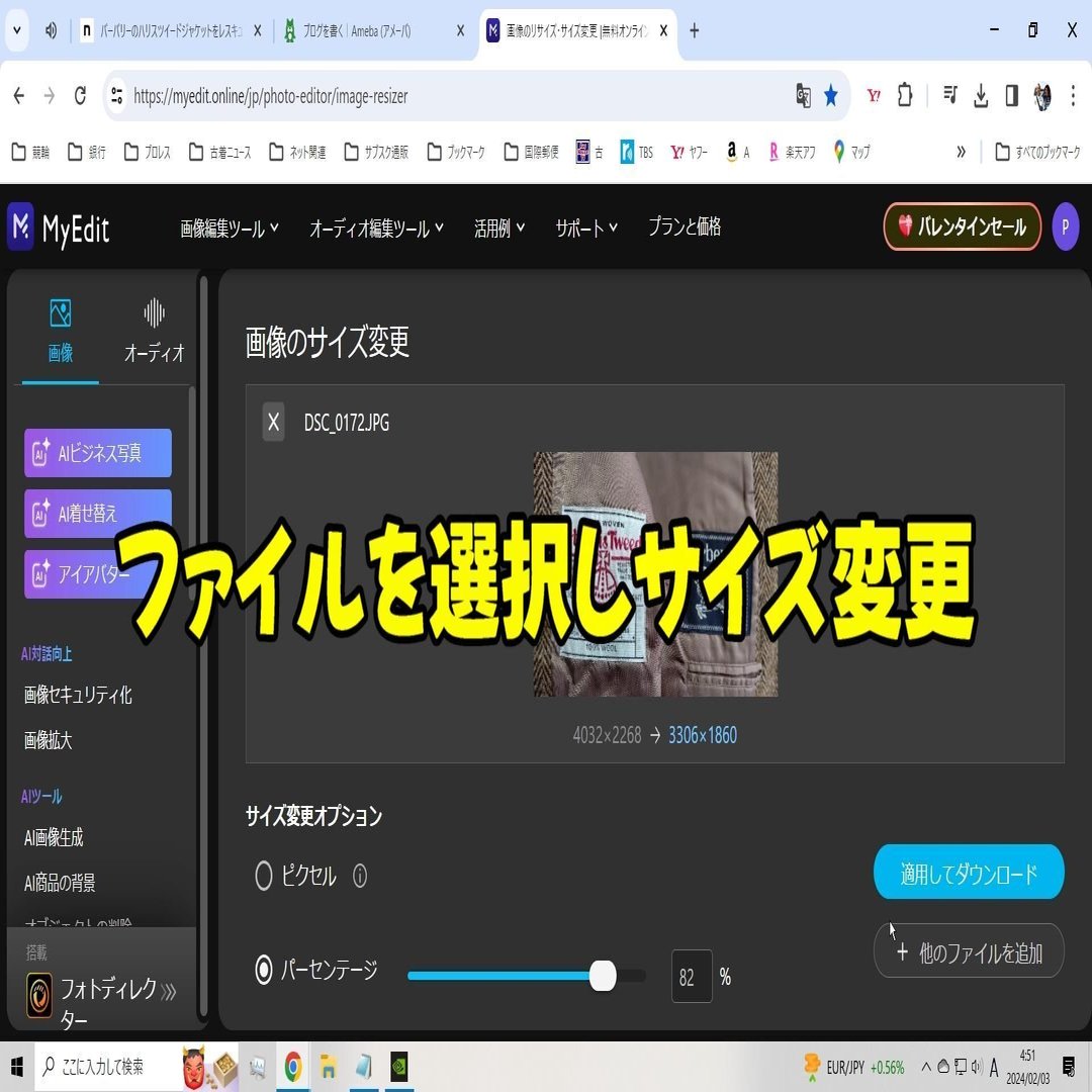 リサイズしたいファイルを選択し、ピクセルを入力して変換するかパーセンテージのバーで変換。