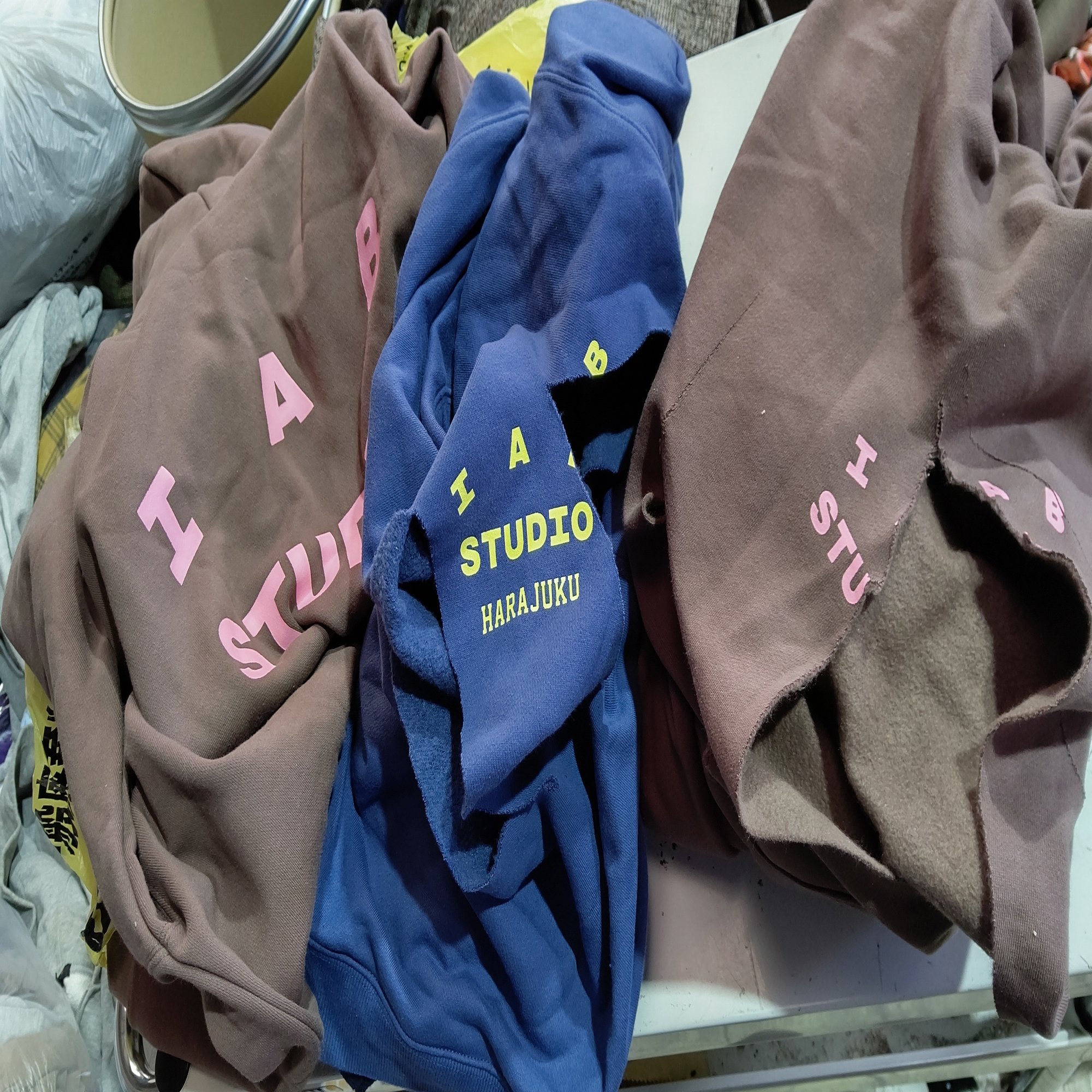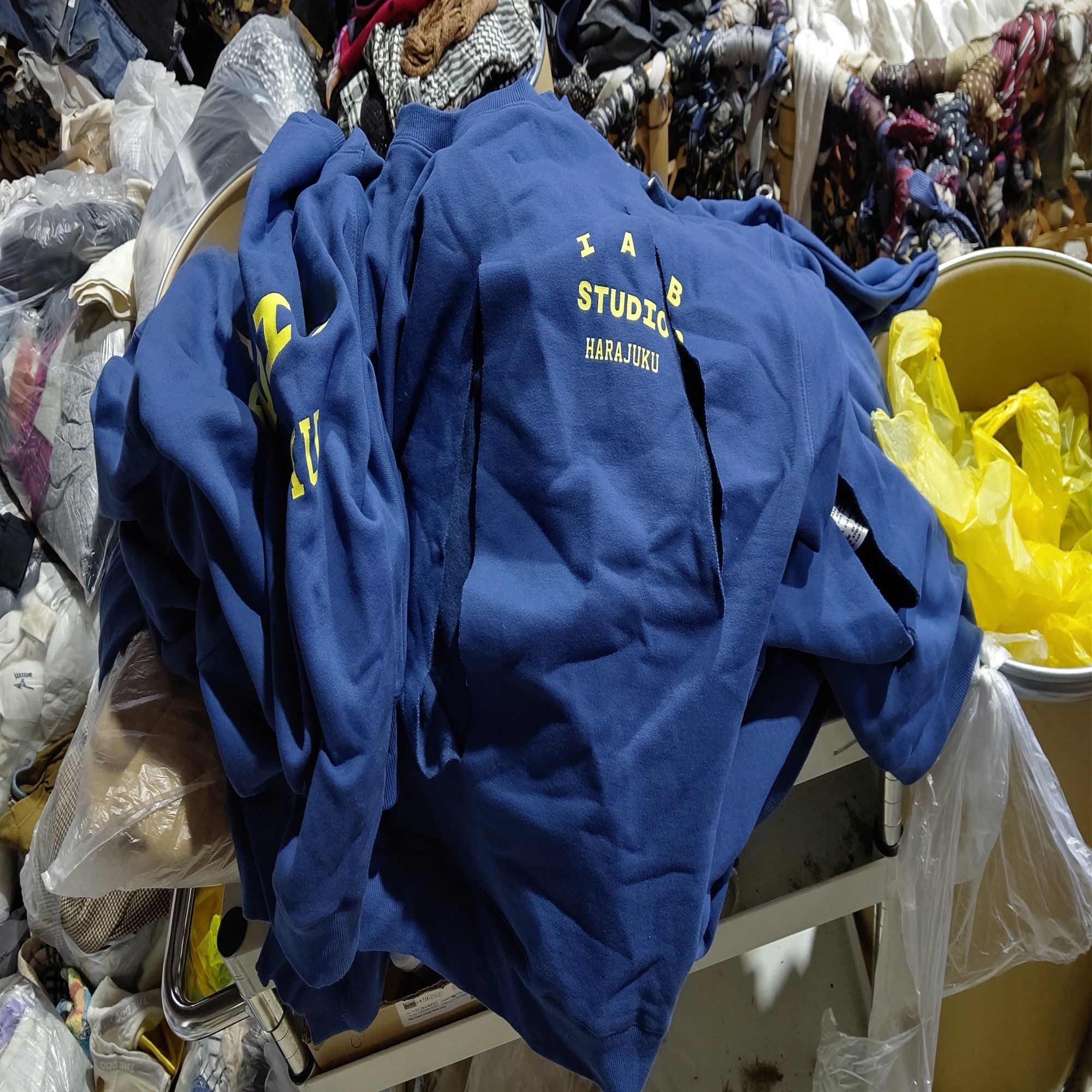 これらはメーカーの在庫処分品でしょうか?カッターで切られたとみられるスウェットシャツが、まとまって出て来ました。