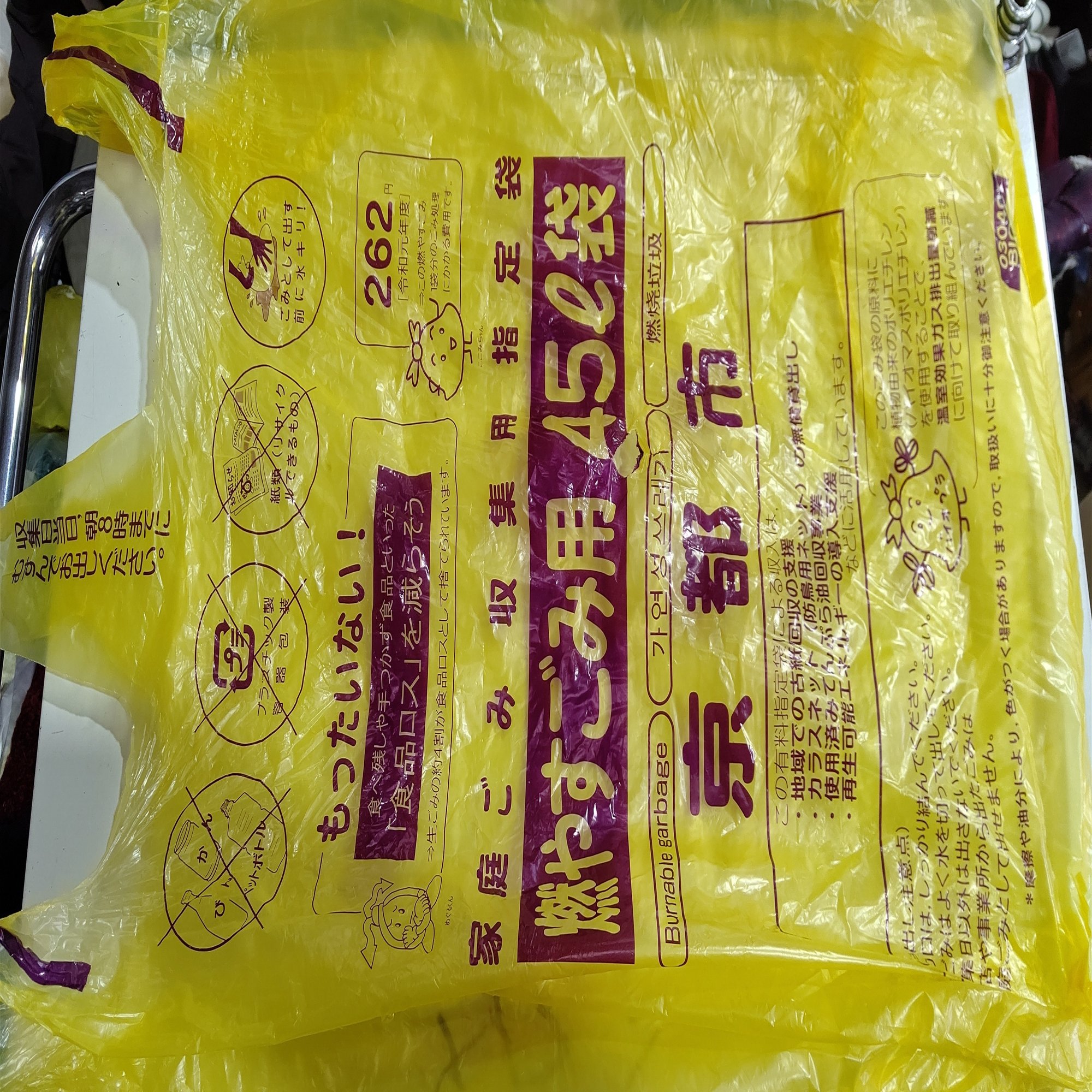 262円(令和元年度)の表示が有ります。ゴミ袋の定価かと思いましたが違いました、このサイズのゴミを処理するのにかかる費用だそうです。京都市のホームページで調べたところ、1枚の定価は45 ℓ 袋で45円でした。