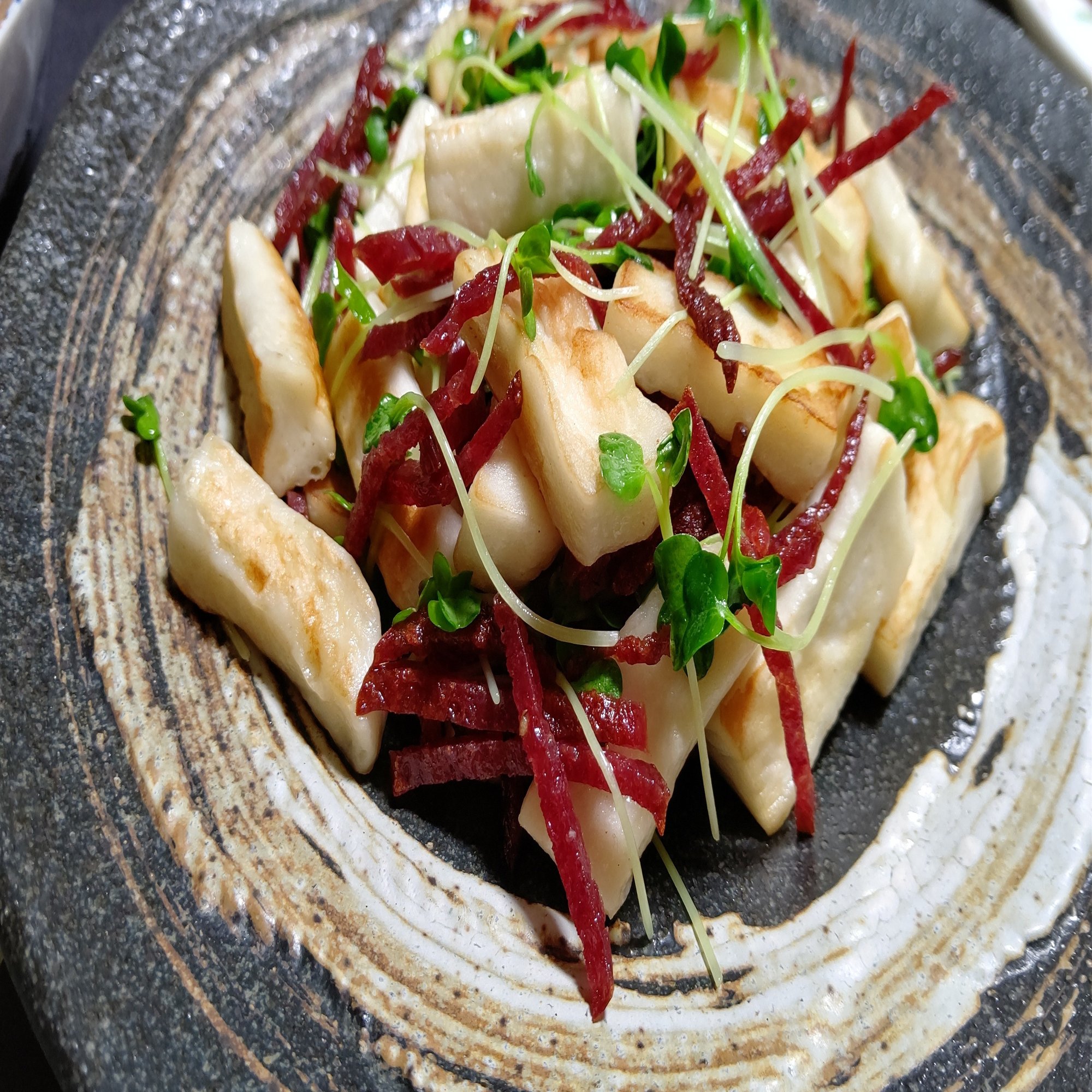 まずはこちらから、はんぺんとサラミの炒め物バター風味です。短冊切りしたはんぺんとサラミソーセージを、バターを入れたフライパンで軽く焦げ目が付くくらいまで炒めます。最後にカイワレ大根を入れて、サッと混ぜれば出来上がり。🍺ビールのおともに最高です。