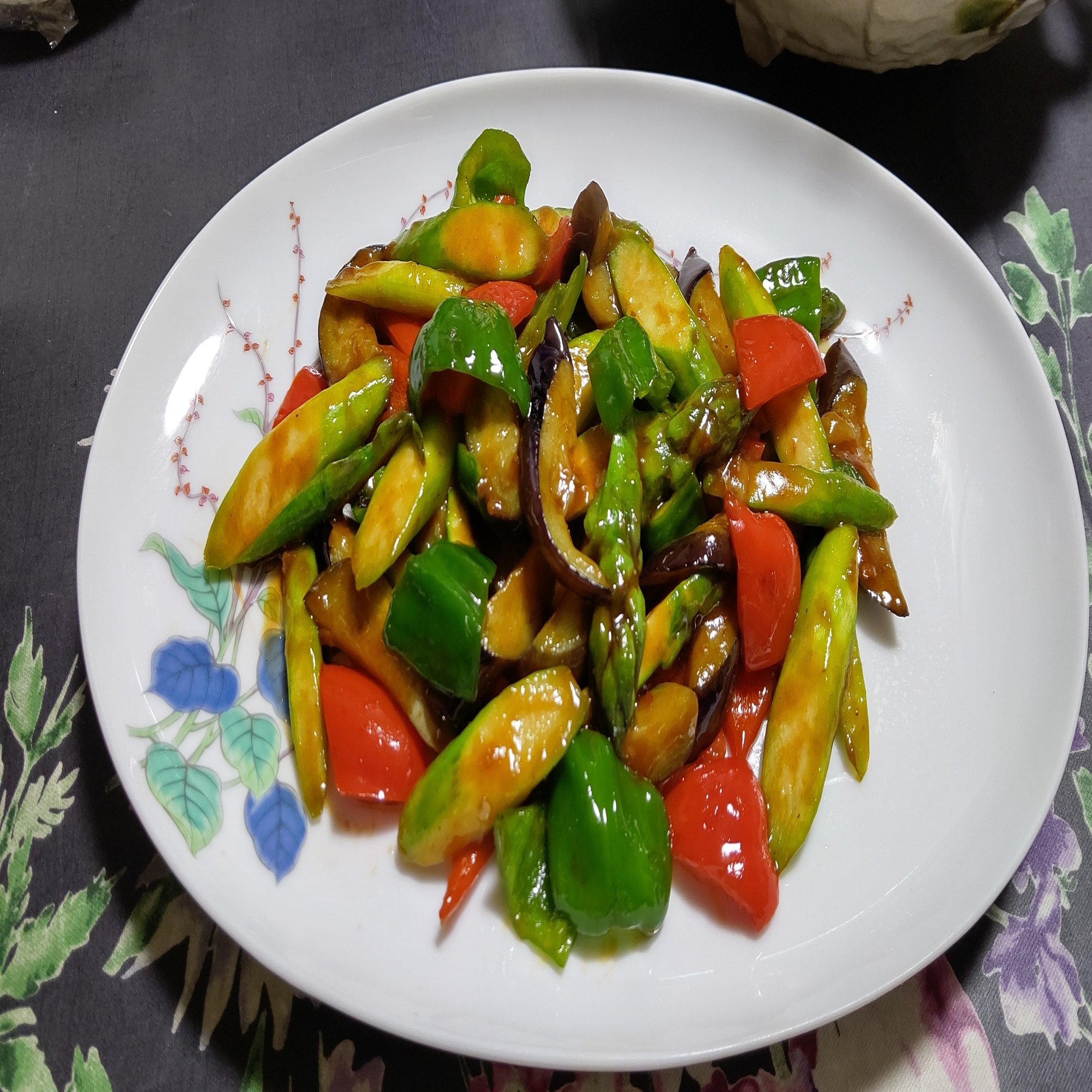 次は、カラフル野菜の中華風炒め、茄子、ピーマン、グリーンアスパラ、赤パプリカを適当なサイズに切って、からし味噌(注)で炒め仕上げにゴマ油を掛けました。