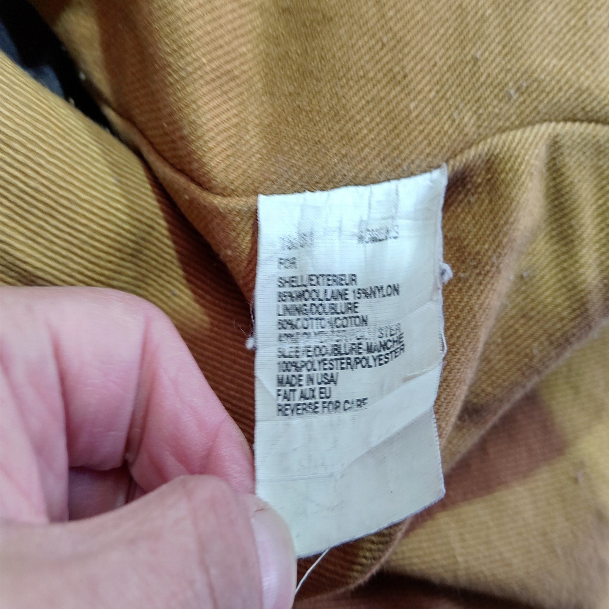 品質表示タグには、85%WOOL/LANE 15%NYLONの表示、ウールリッチじゃないじゃん!毛玉が目立つのもナイロン混紡のせい。
