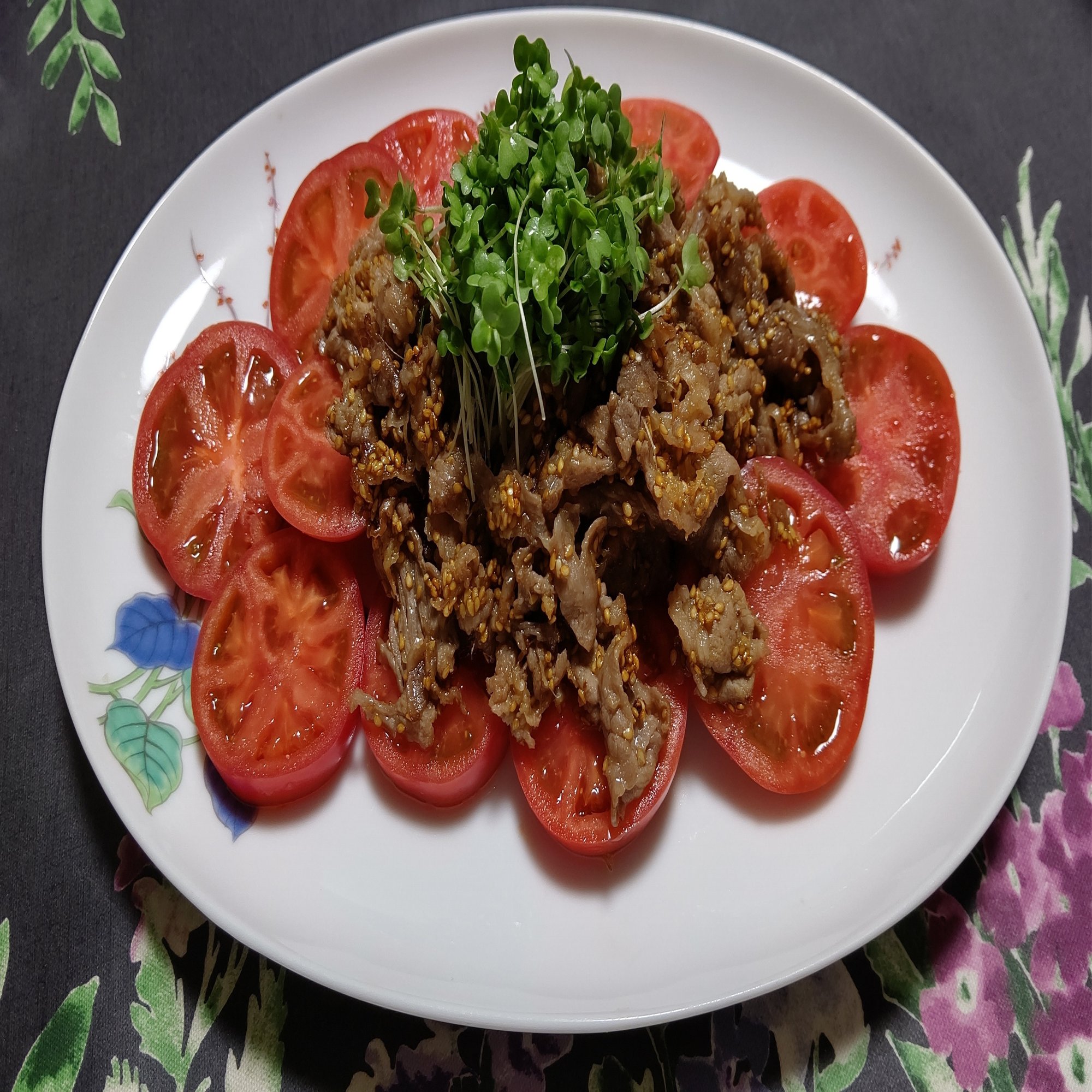 材料は🍅トマト、牛肉の切り落とし、カイワレかスプラウトあるいは🌿パクチーに🧄ニンニクとショウガ、調味料。