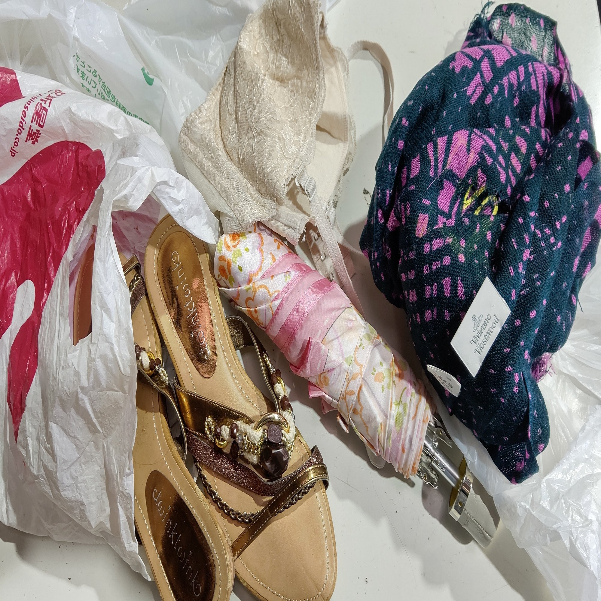 こちらの画像は、先日回収された古着の中から出て来た物。ストール、ブラジャー、折り畳み傘にサンダル。この中でラグハウスで取り扱えない物は何だかわかりますか?それは唯一☂折り畳み傘なんです。その他の物は全て海外でリユースされています。