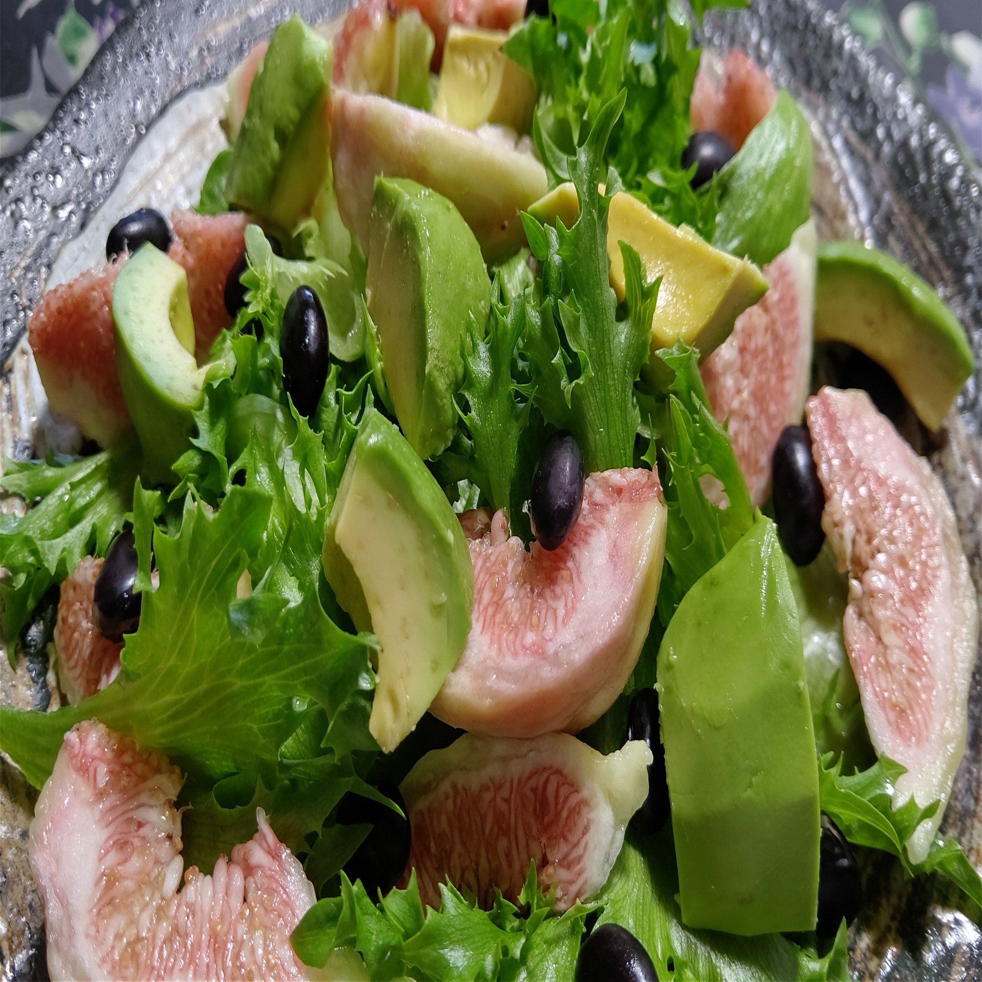 ③大皿にフリルレタスを盛り付け、その上にイチジクとアボガドをバランスよく配置。①の黒豆を散らして完成。お好みのドレッシングで召し上がれ。