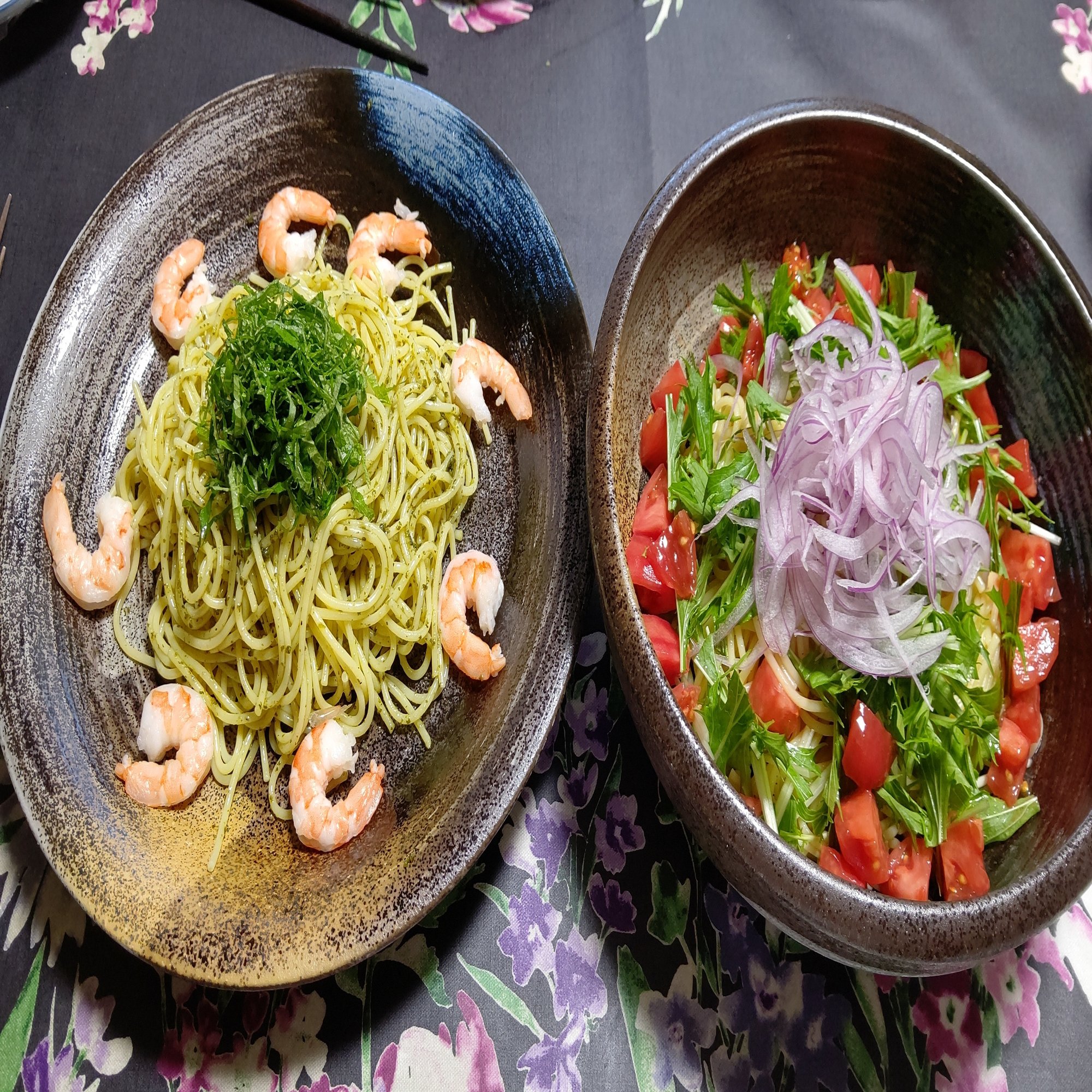 🍴冷製パスタ2種🍝エビとバジル🌿とアンチョビトマト🍅ある日の🥢夕飯メニュー🍚創作家庭料理