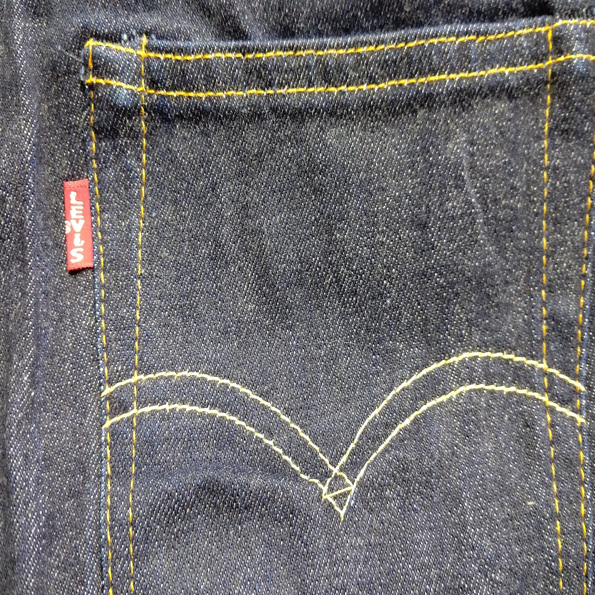 バックポケのアーキュエイトステッチは退色した感じ、Big”E”均等V赤タブ。