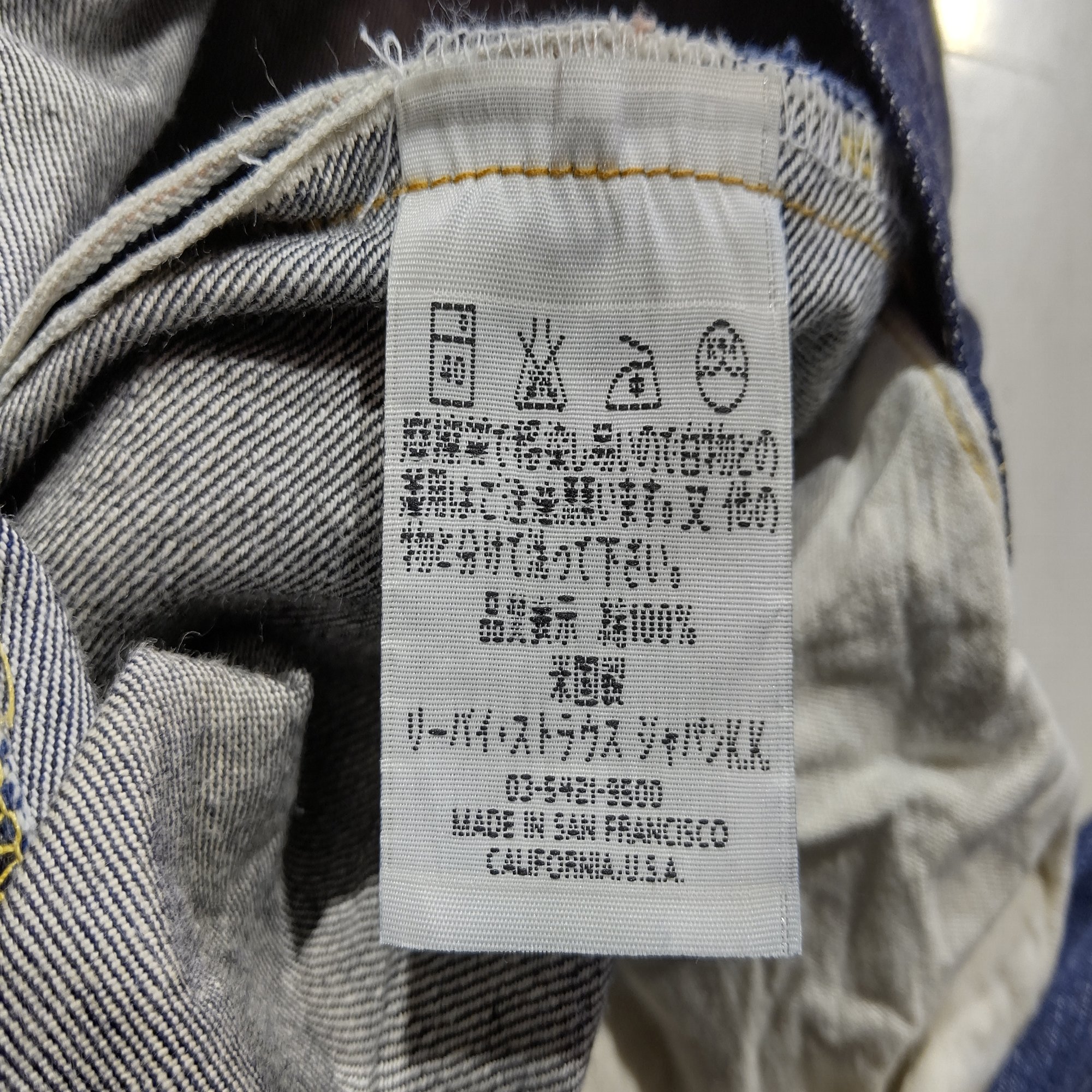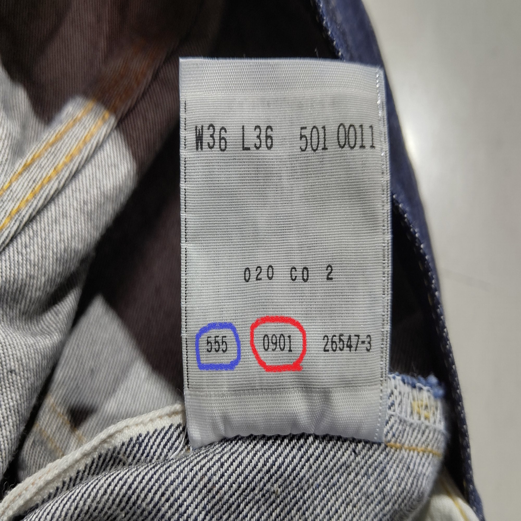 内タグのマーキングした部分の数字から、米国カリフォルニア州サンフランシスコの555バレンシア工場製造で、製造年月日が2001年09月なのが分かる。リーバイスジャパン製。