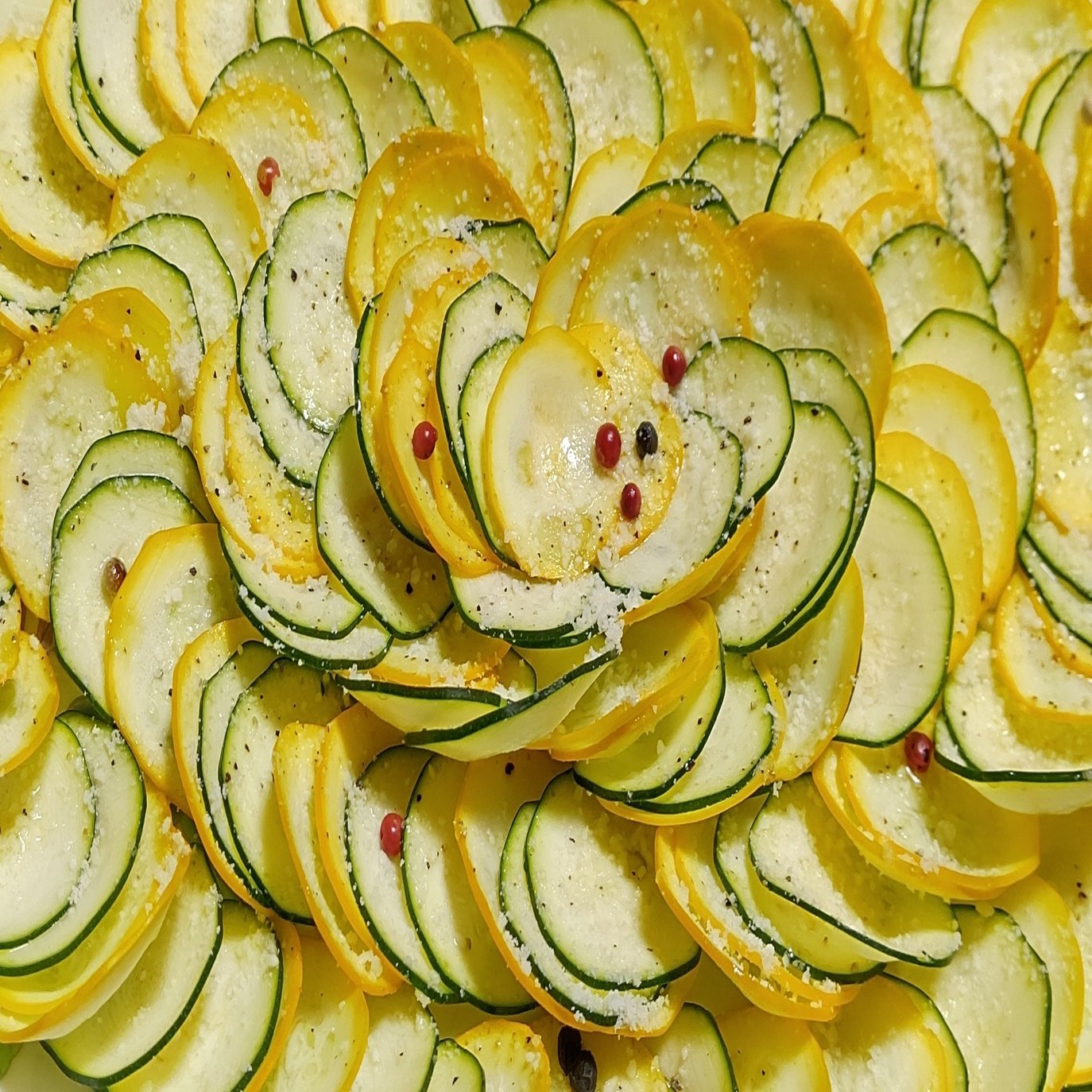 【材料】黄色と緑色のズッキーニ、オリーブオイル、粉チーズ、🍋レモン果汁、ピンクペッパー、ブラックペッパー。