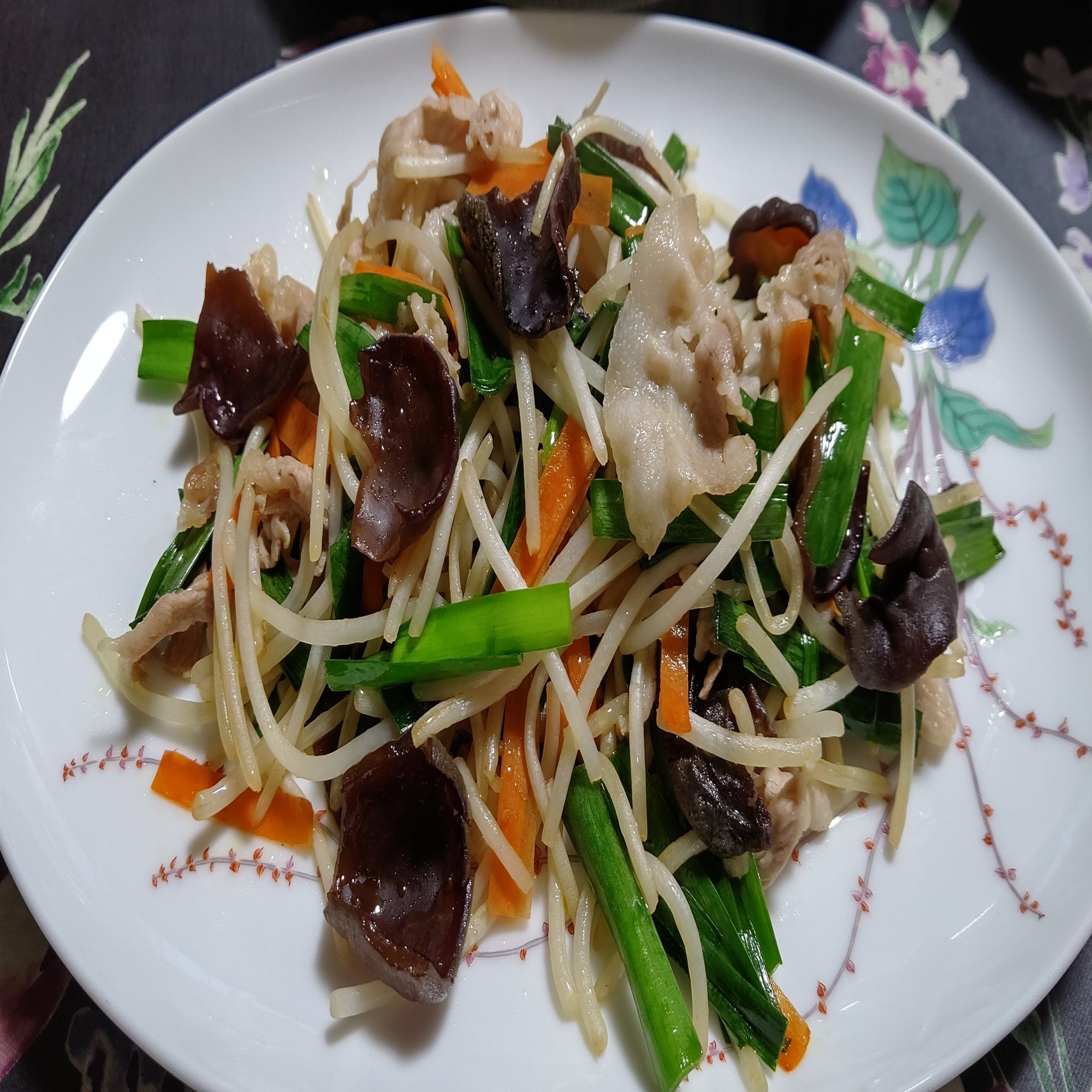 【材料】豚バラ、人参、もやし、にら、きくらげ、ニンニク、中華だし、塩、コショウ。