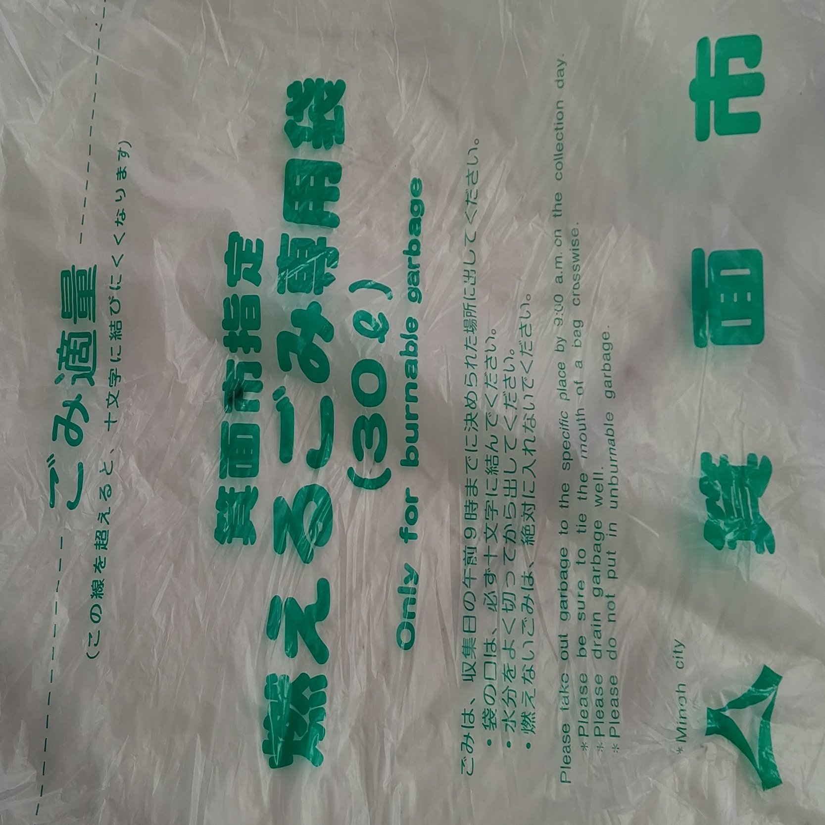 こちらは大阪府箕面市、30L燃えるゴミの指定袋。『袋の口を十文字に結ぶ』・・・どうゆう事?意味不明、きちんと結んでという事なのかな。注意書きには英語表記も有り。